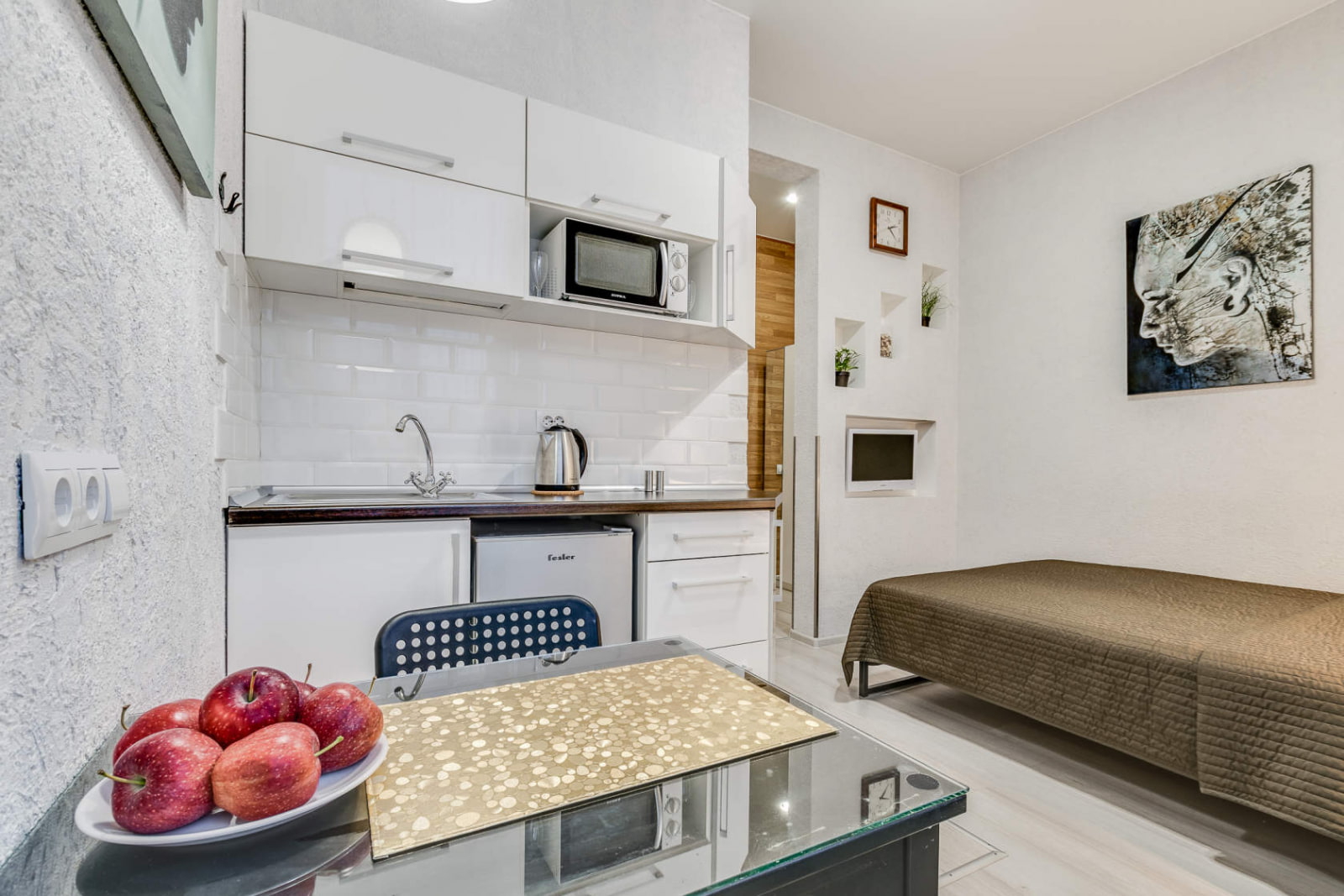 In the photo there is a small-sized kitchen-studio with a folding berth.