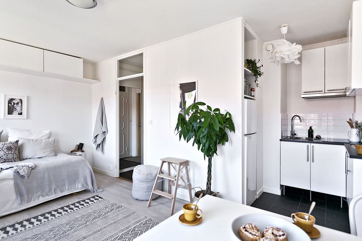 With sufficient footage, it is possible to delimit the combined premises into three functional areas in the form of a bedroom, kitchen and dining room.