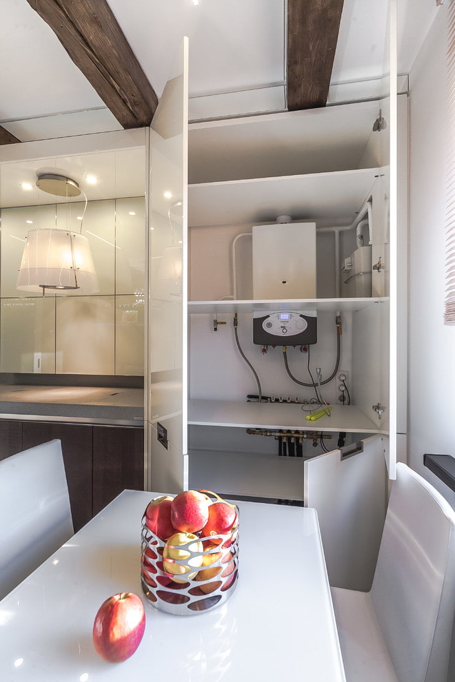 If you are a fan open kitchens, and instead of cabinets, you prefer to use shelves, the gas pipe will not be a problem. It will fit well into a modern interior and, being among the jars, bottles and decor, will not attract attention.