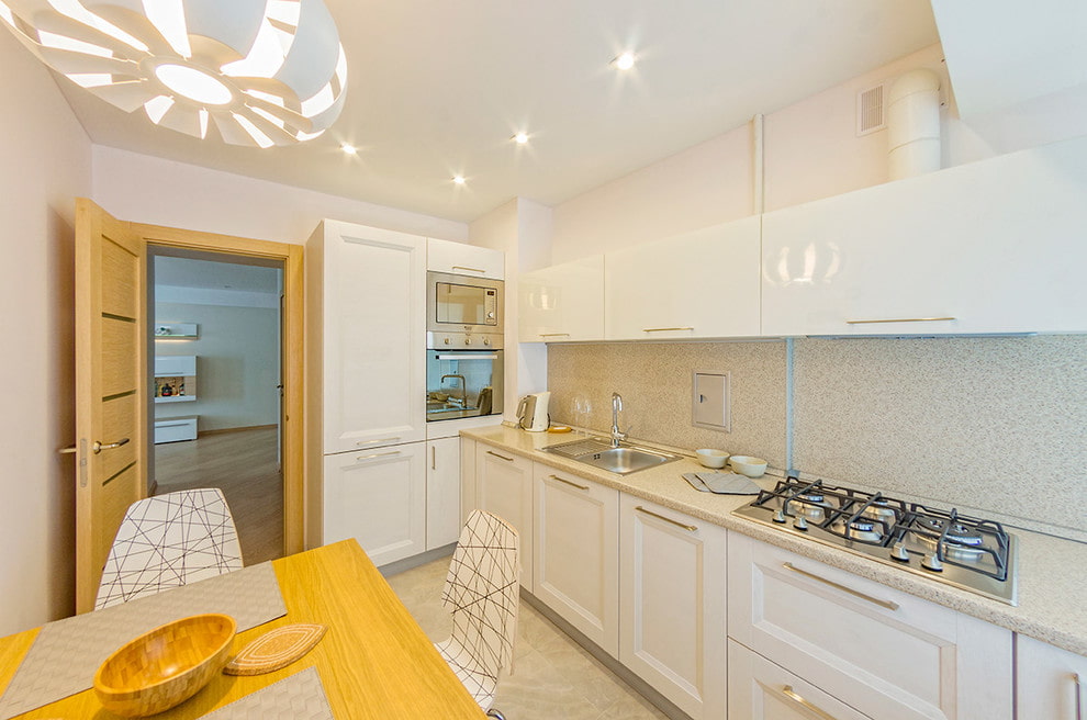 When ordering a kitchen, provide wall and floor cabinets with holes in the right places: this will allow you to close the gas pipe, and the aesthetics will hardly be affected.