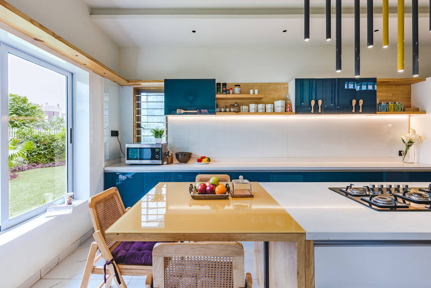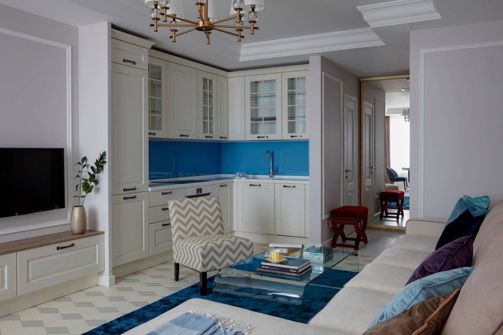 The photo shows a kitchen with blue accents in the style of a modern classic.