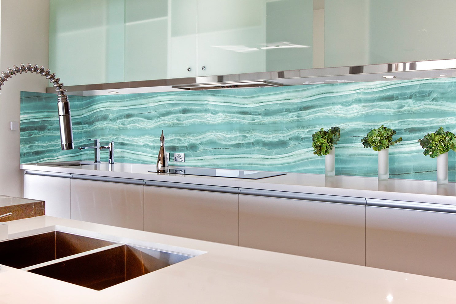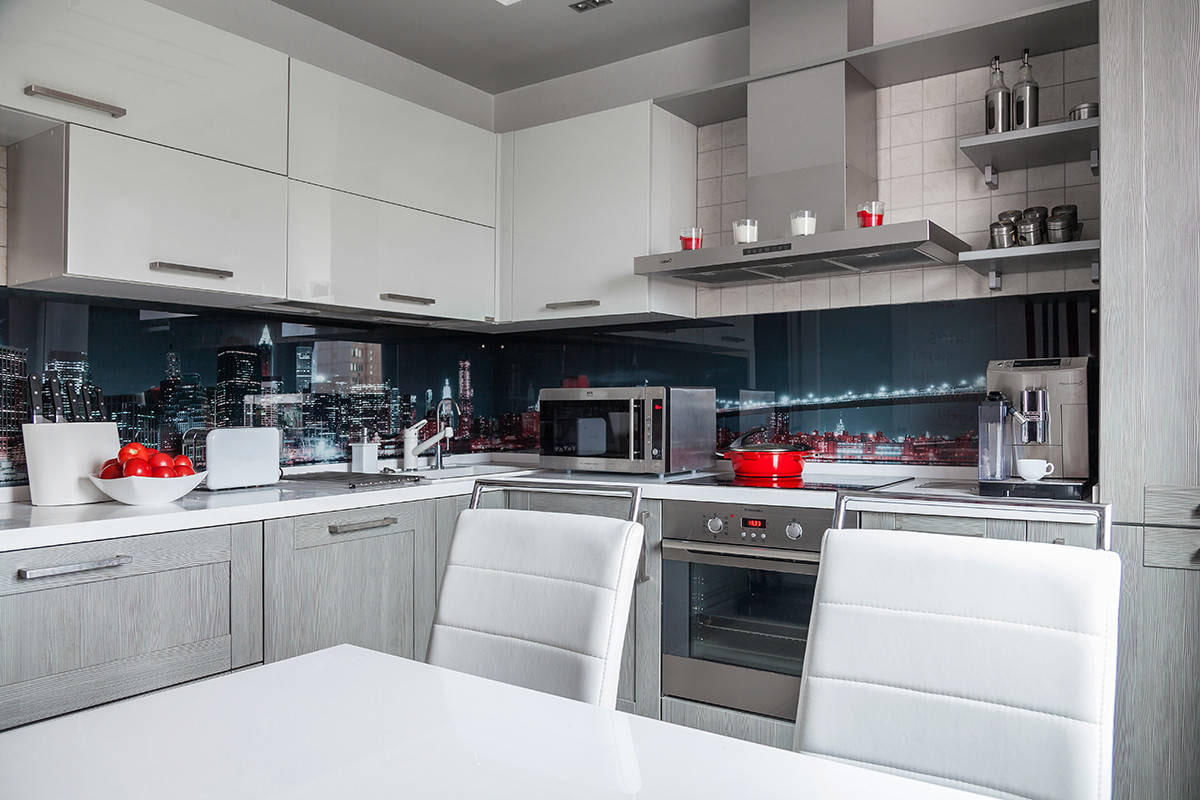 Add a little lighting and the glossy glass surface will sparkle and transform the whole environment. The easiest way to make a backlight is to install a moisture resistant LED strip underneath your kitchen cabinets. It evenly and effectively illuminates the cooking area.
