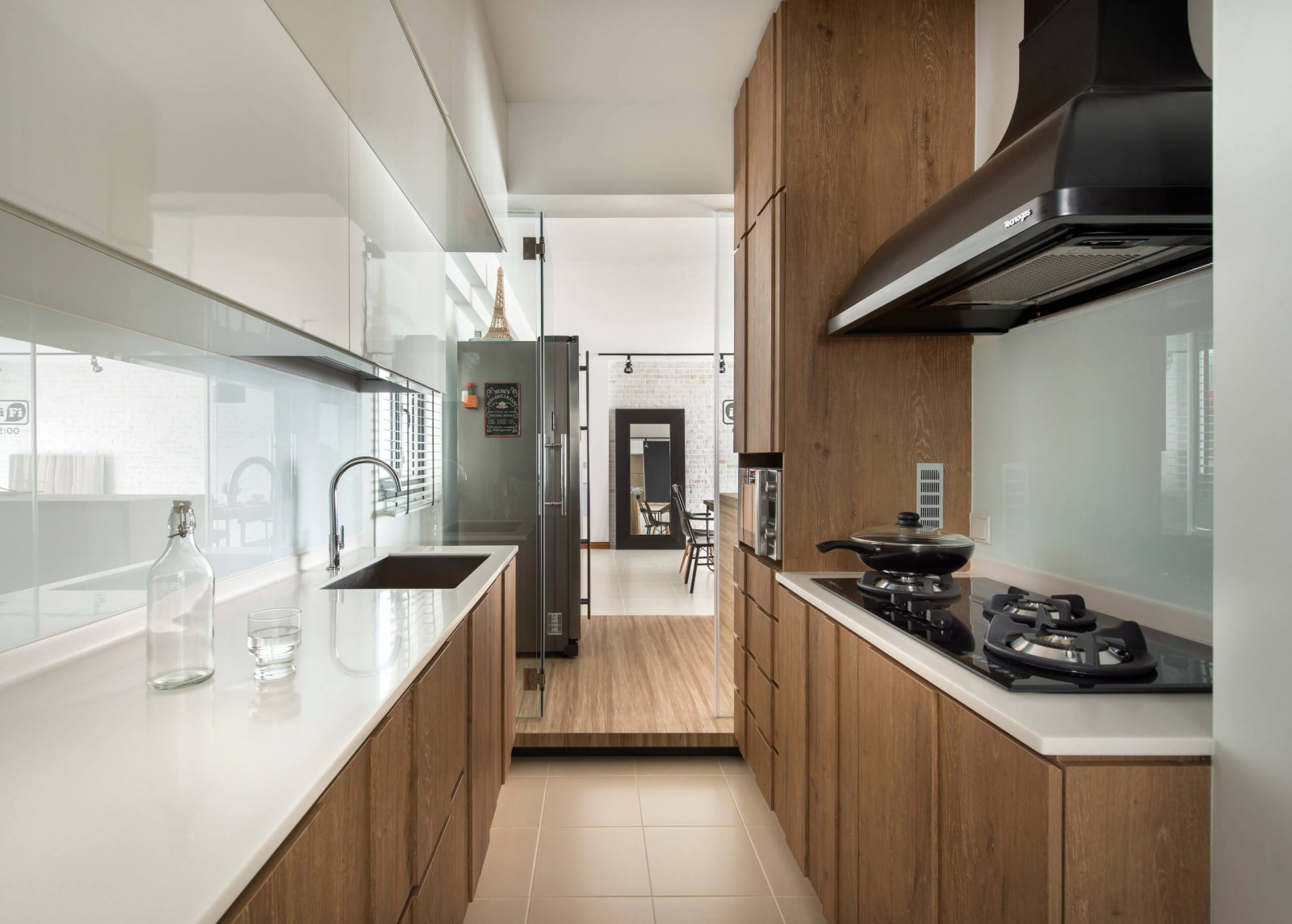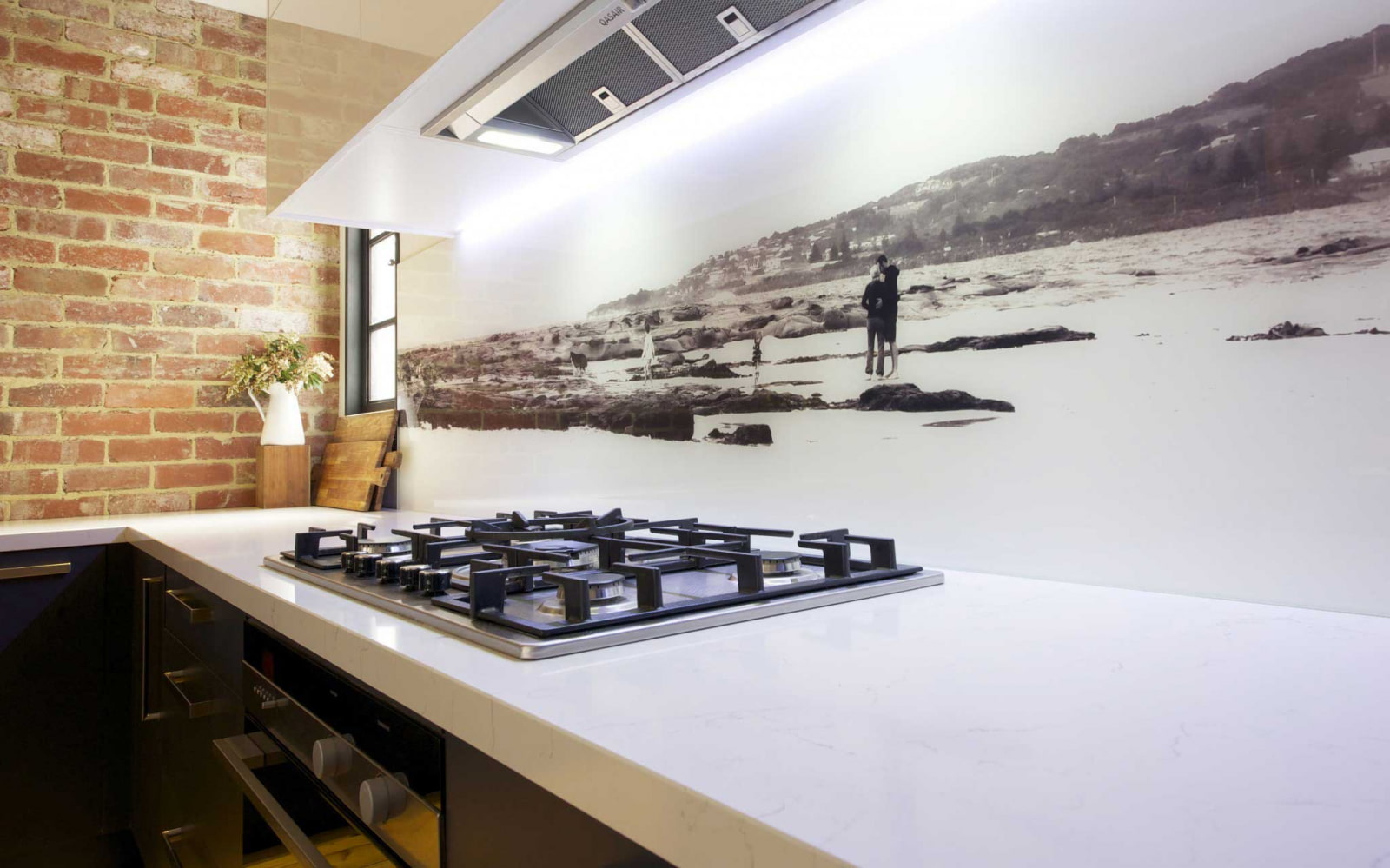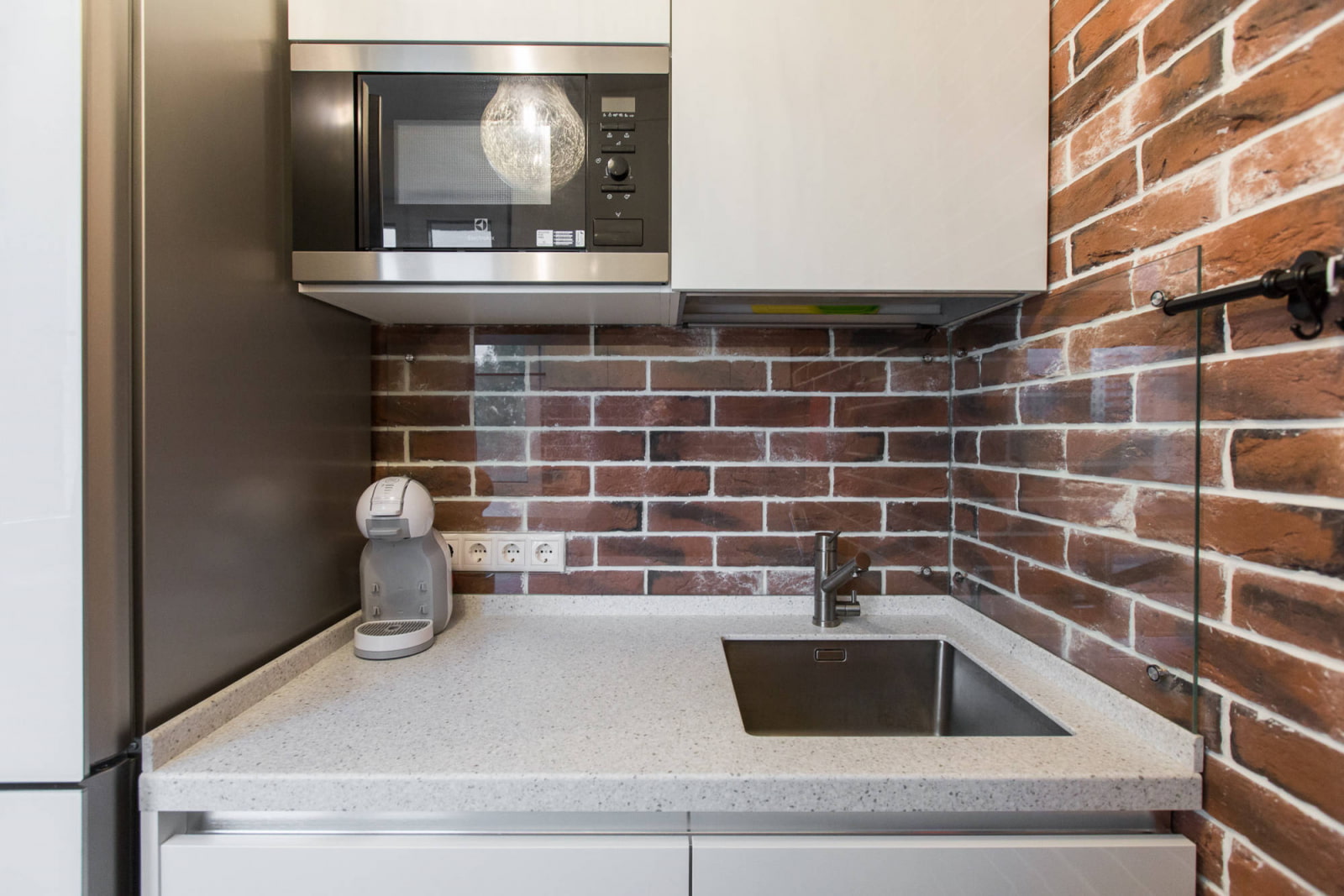 The kitchen, designed in an industrial loft style, includes many light and glossy surfaces in addition to the rough finish. If there is brickwork in the cooking area, the glass will protect the textured wall without hiding it.