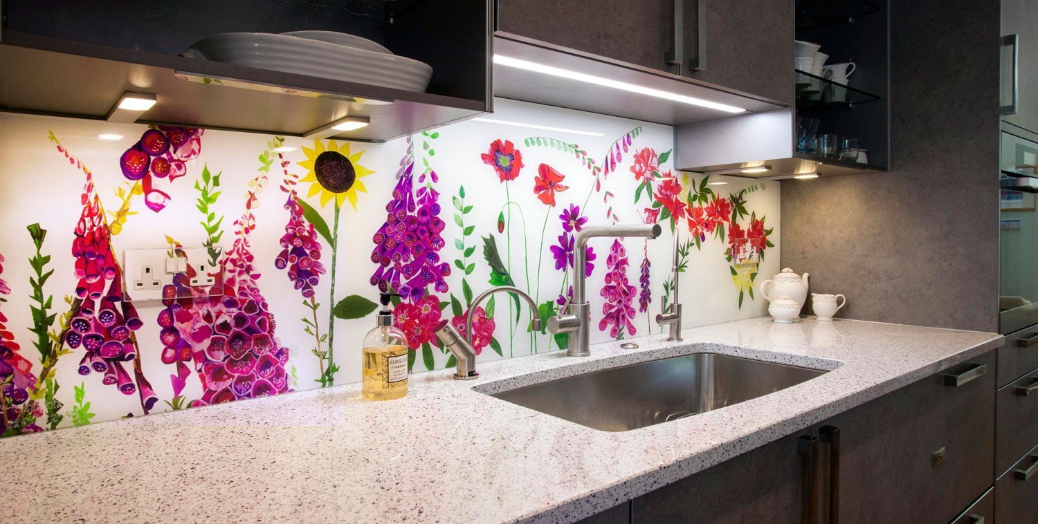 The photo shows an unusual plexiglass panel with a bright floral print.