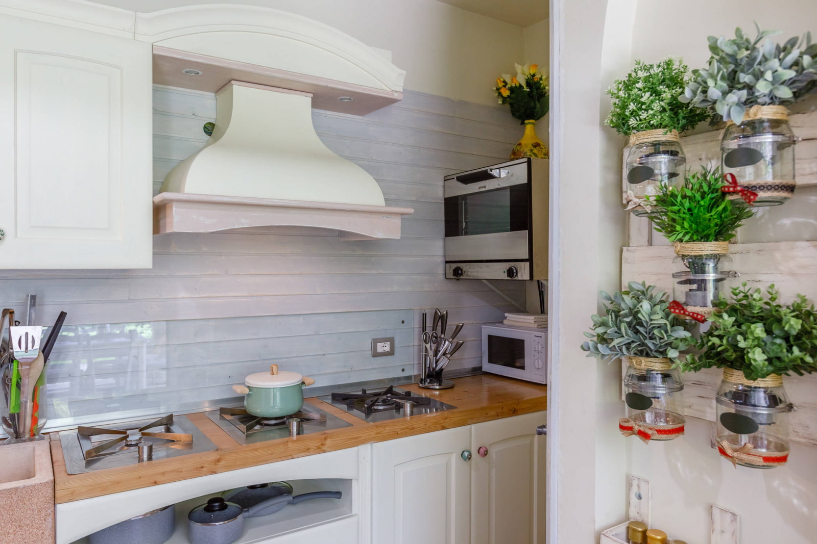 In the photo there is a compact corner kitchen with a colored polycarbonate apron.