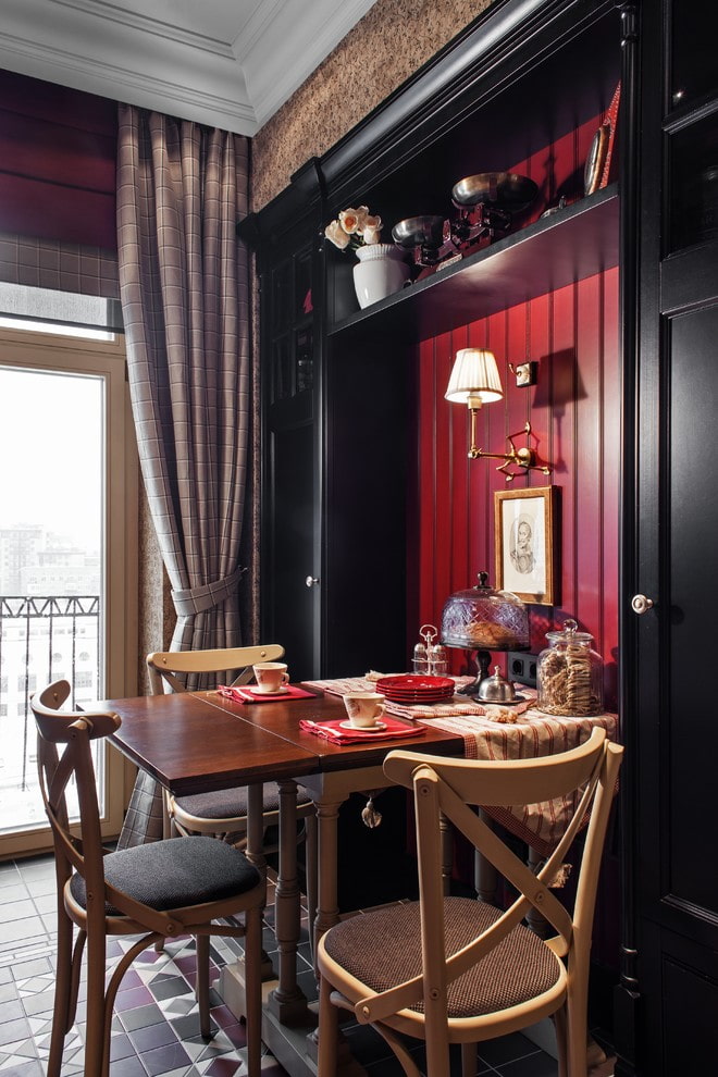 An artificially created niche, inside which a dining table is placed, helps to make the kitchen atmosphere more expressive and private. The structure can be made of drywall and decorated with clinker tiles, or use shallow cabinets.