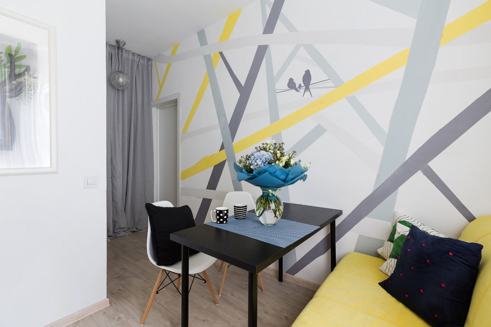 For a small kitchen, this is ideal. To create an environment that looks more expensive than it actually is, it is worth purchasing one roll of expensive designer wallpaper and decorating your dining area with it.