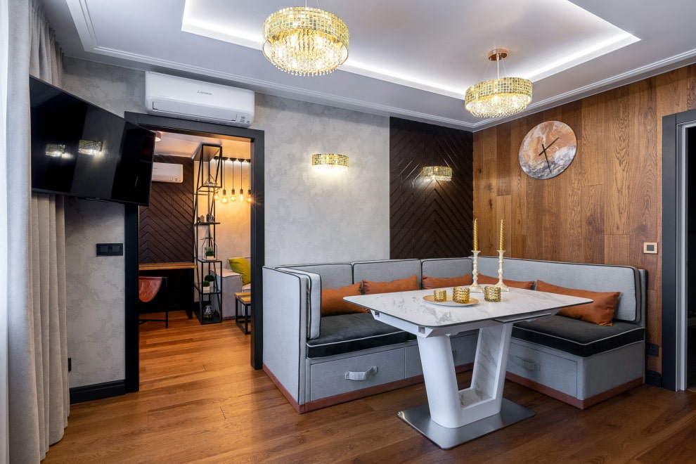 If the kitchen is designed in a modern classic style, the area above the dining group should be highlighted with moldings, enclosing graceful lamps in frames.