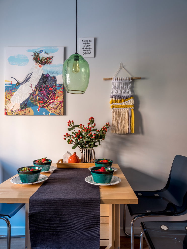 If you want the dining area to look more solid, decorate it with a real picture in a carved frame. Reproductions and images from souvenir shops reduce the cost of the interior, so we recommend choosing inexpensive paintings by novice artists for decoration.