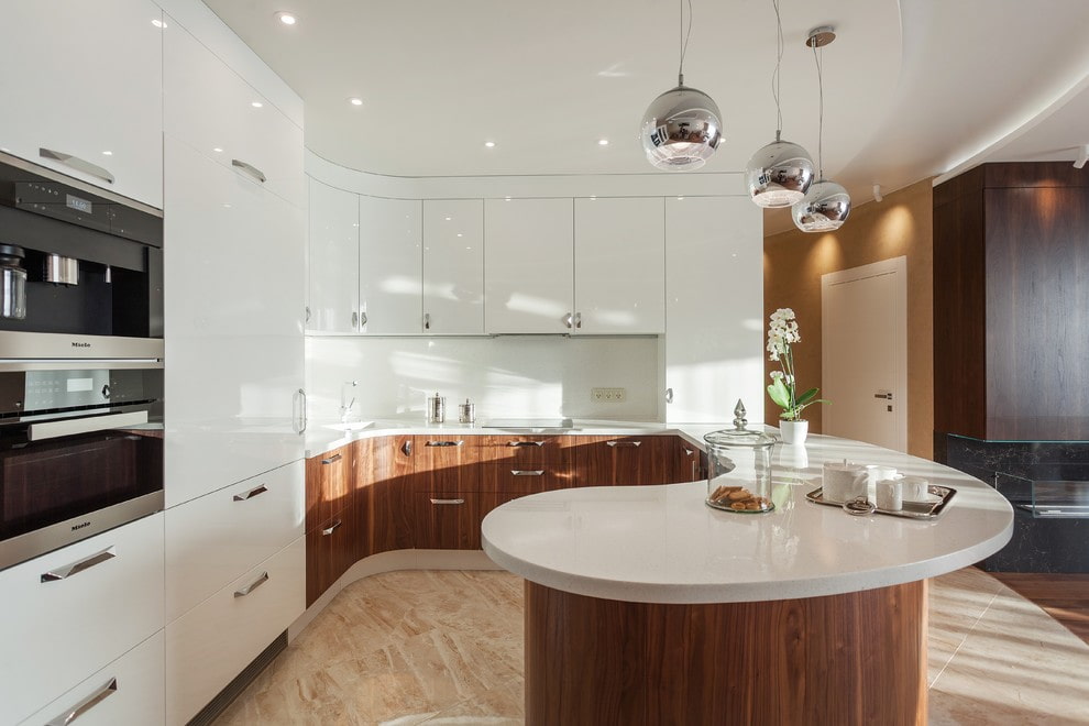 The photo shows an unusual kitchen with a polished radius countertop made of bulk stone.