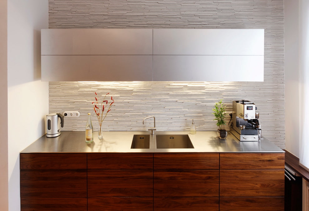 In the photo there is a kitchen with a metal worktop that fits perfectly into the high-tech high-tech style, echoing with chrome elements, built-in lighting and a mirrored apron.