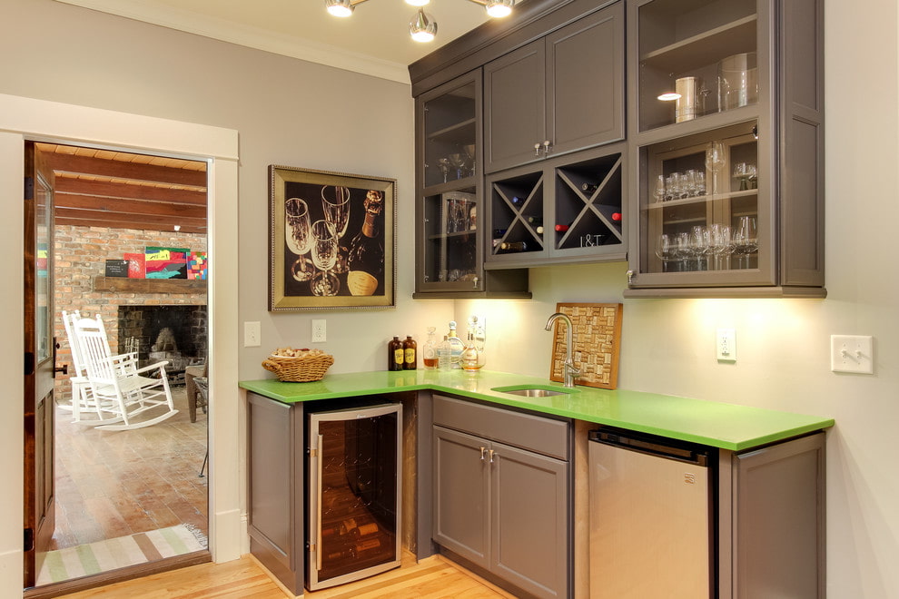 The kitchen countertop made of interior concrete is gaining its popularity due to the practicality of the material: it combines the positive characteristics of natural stone and low cost. Moreover, if desired, the slab can be made independently by decorating it with decorative splashes: multi-colored pigment, broken glass, beads, coins.