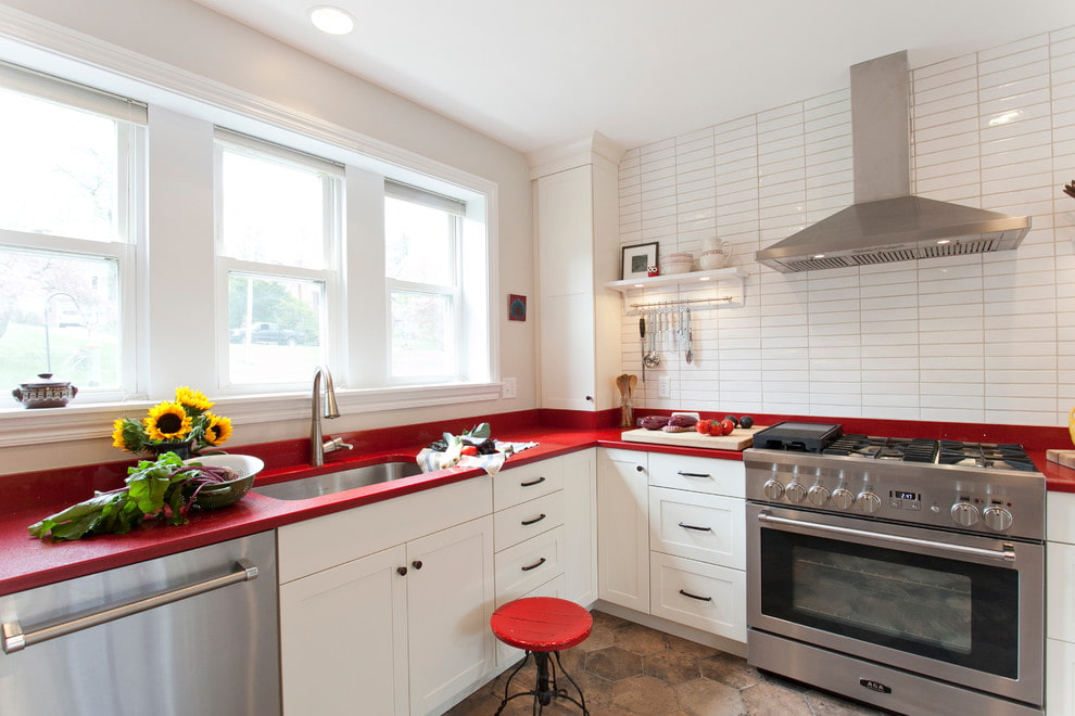 In the photo there is a kitchen with a long quartz countertop located along the window.