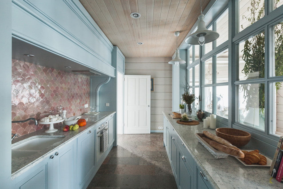 The countertop is an element that helps to maintain the chosen style direction, since it takes up a lot of space in the kitchen.