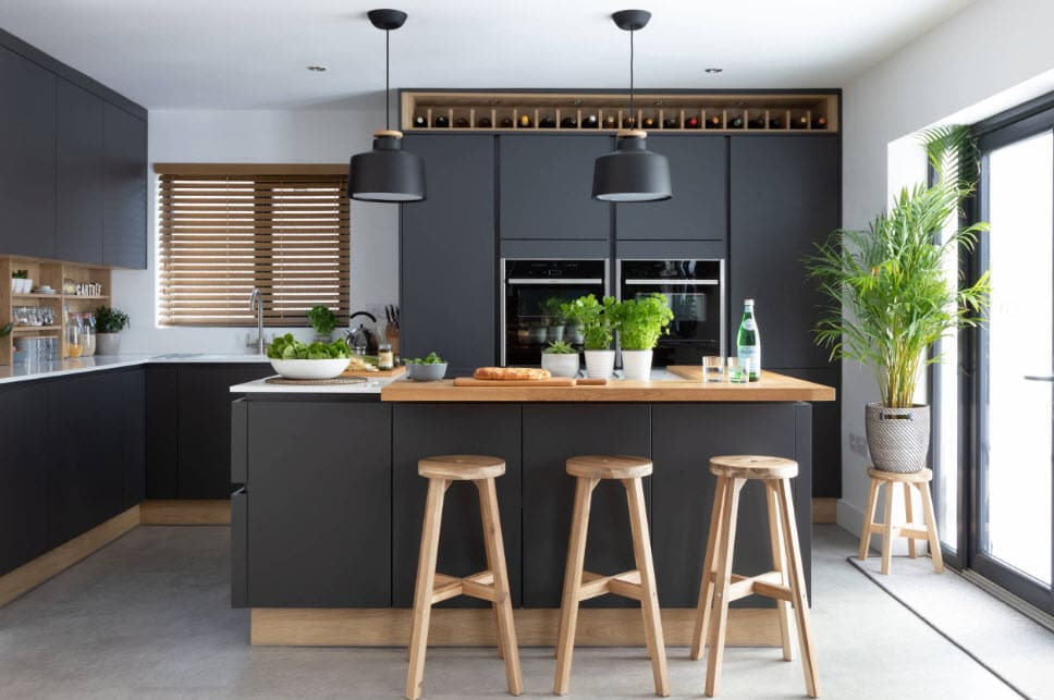 The photo shows a stylish interior of a black kitchen. The matte set creates a cozy, enveloping atmosphere. White furniture and wood décor enliven the interior.