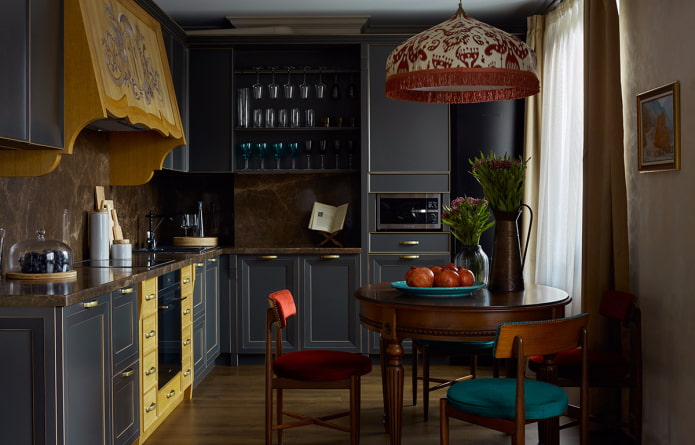 One of the disadvantages of a dark colored kitchen is that dirt or damage becomes especially noticeable, so the set requires careful maintenance. The peculiarity of this palette also lies in the fact that its excess makes the atmosphere too gloomy. In dimly lit or small rooms, it is better to minimize dull colors or use them only as accents.