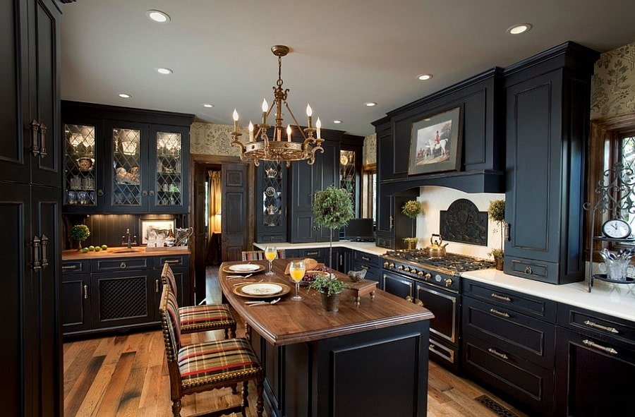 The photo on the right is an example of a dark classic kitchen. Wooden floors and warm color schemes add a touch of comfort.