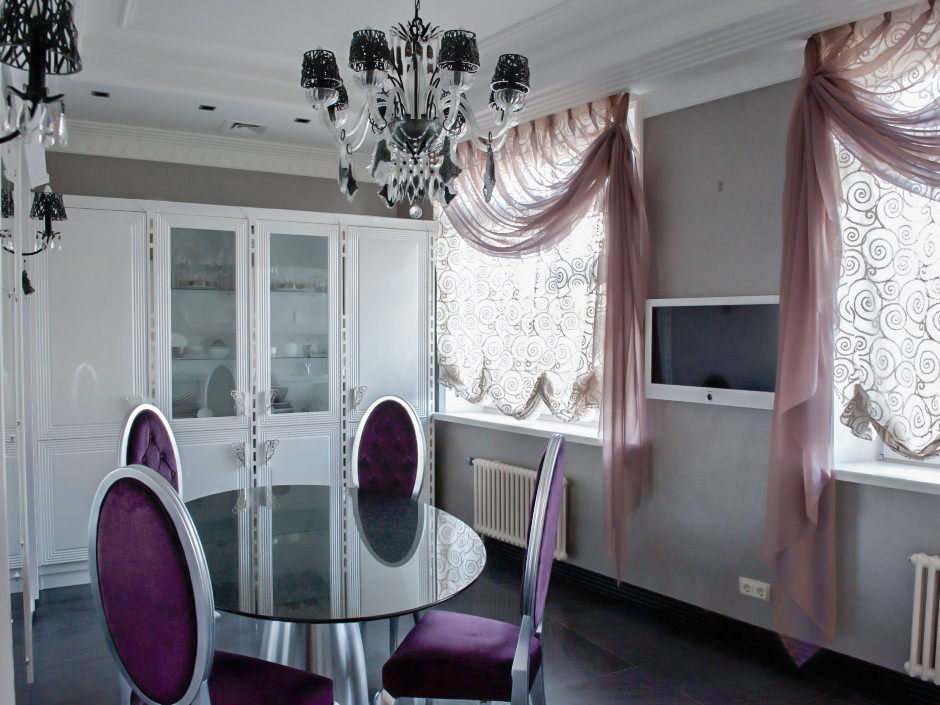 Requires pomp and wealth. Laconic tulle in the kitchen with such an opening will look less interesting.