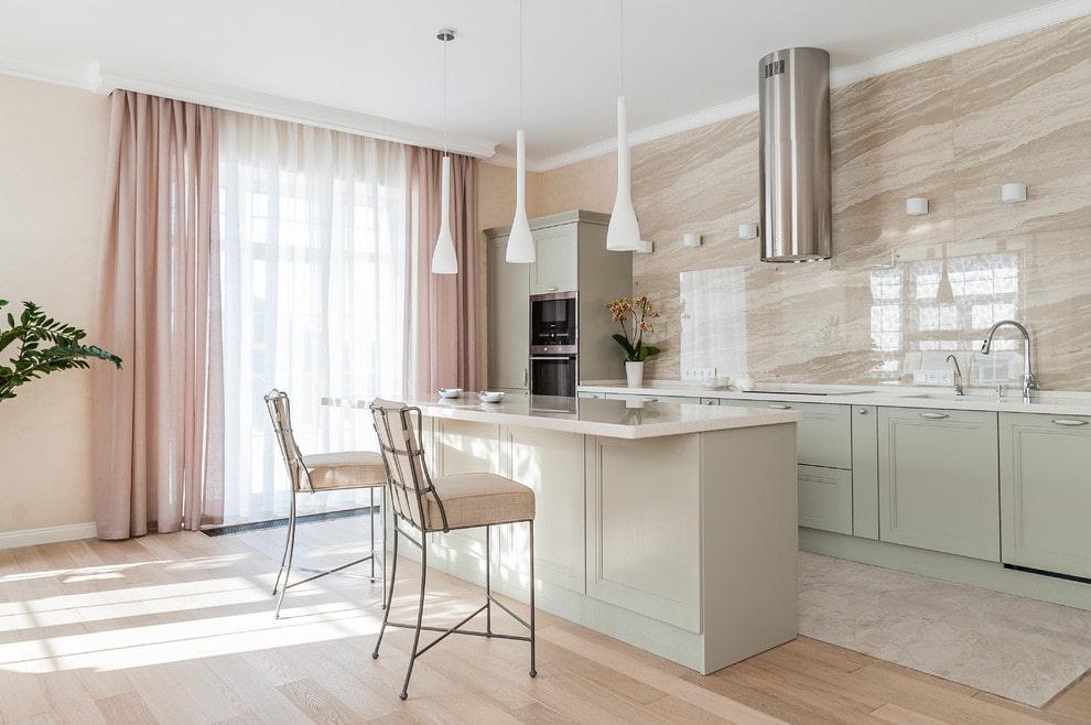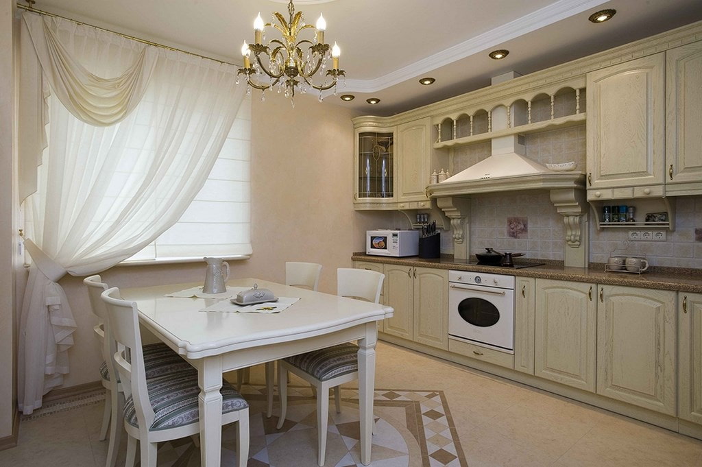 The classic style is appropriate in rooms with a large area, as it means floor-length curtains. In the classics, tulle in the kitchen is either white or light pastel colors. Small drawing is allowed on the material.