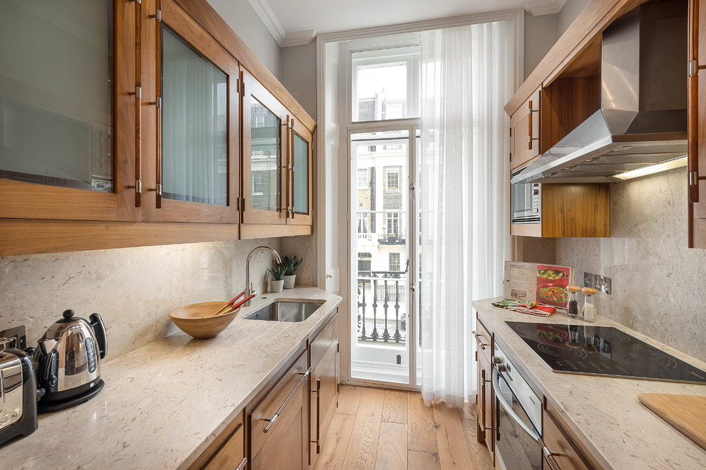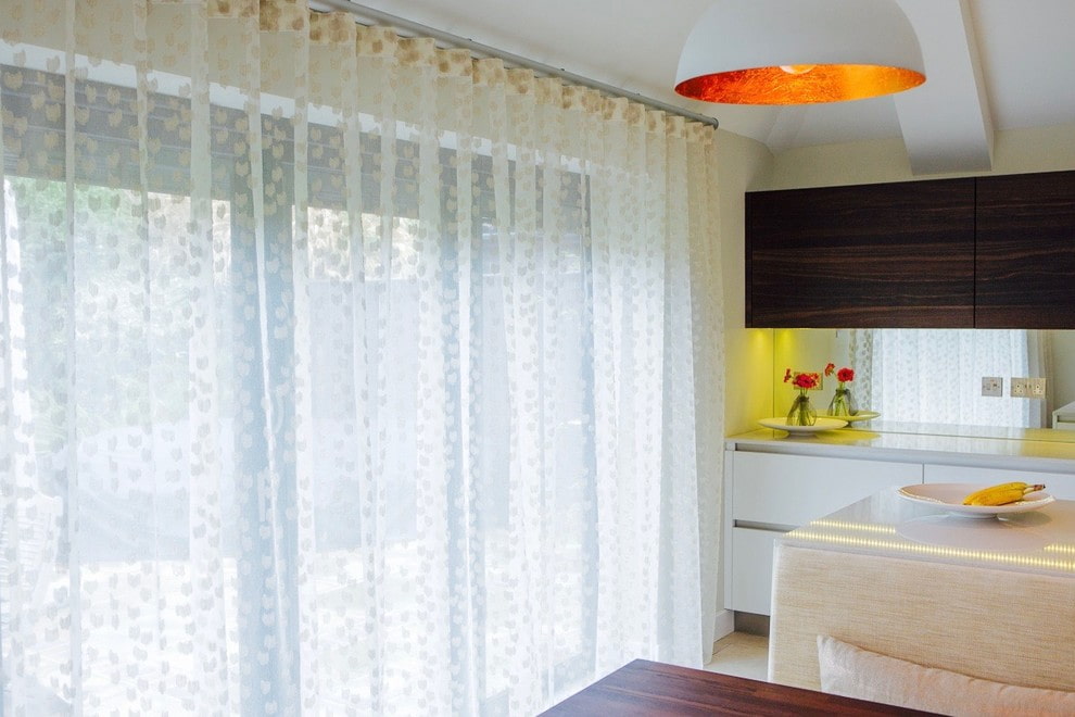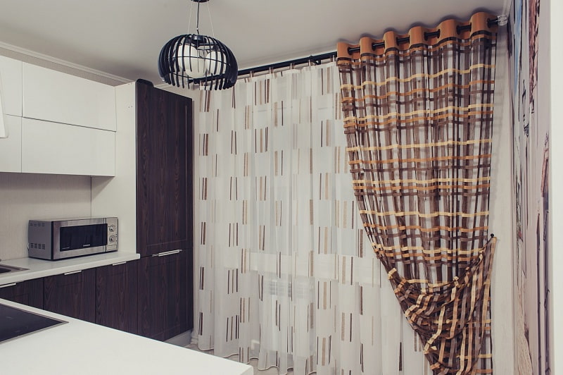 This type of tulle in the kitchen is ideal for small spaces. It looks very modern and unusual.
