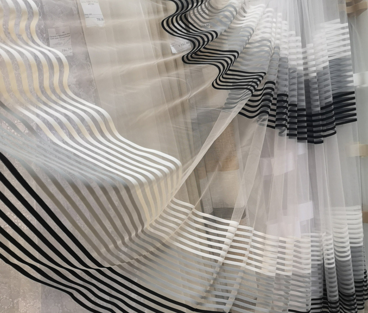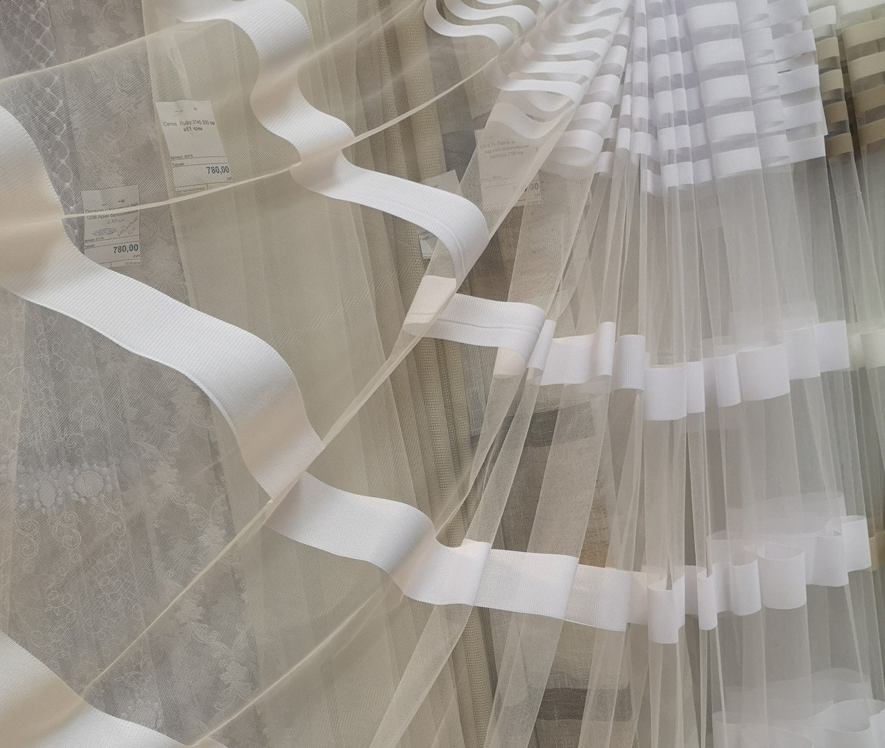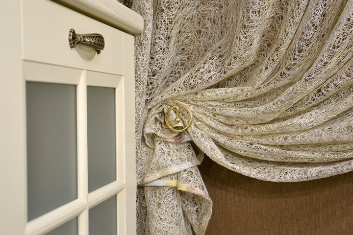 They perfectly hold any kind of fabric without deforming the upper edge, and allowing the fabrics to fold into graceful flounces, which is especially important when choosing tulle for the kitchen-living room.
