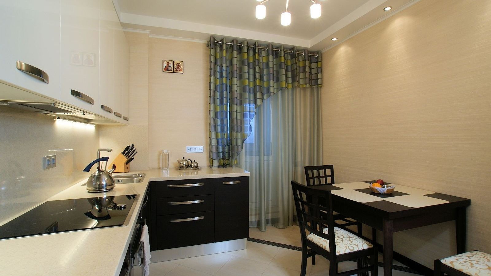 Classic combination. In the daytime, light tulle will decorate the window, letting in the light, and in the dark, the drawn curtains will protect the kitchen with the lights on from prying eyes.