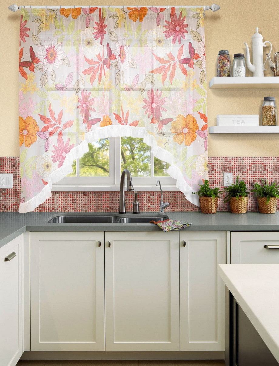 Smooth, soft, translucent fabric. Main feature using voile curtains in the kitchen is the ability to transmit and diffuse sunlight, which is an advantage when choosing a window frame that is oriented to the dark side.