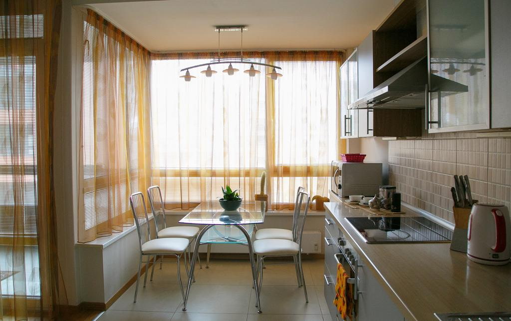 The main task of the bay window in the kitchen: to give the room an increased degree of illumination, based on this, the tulle for the window should not prevent sunlight from entering the room.