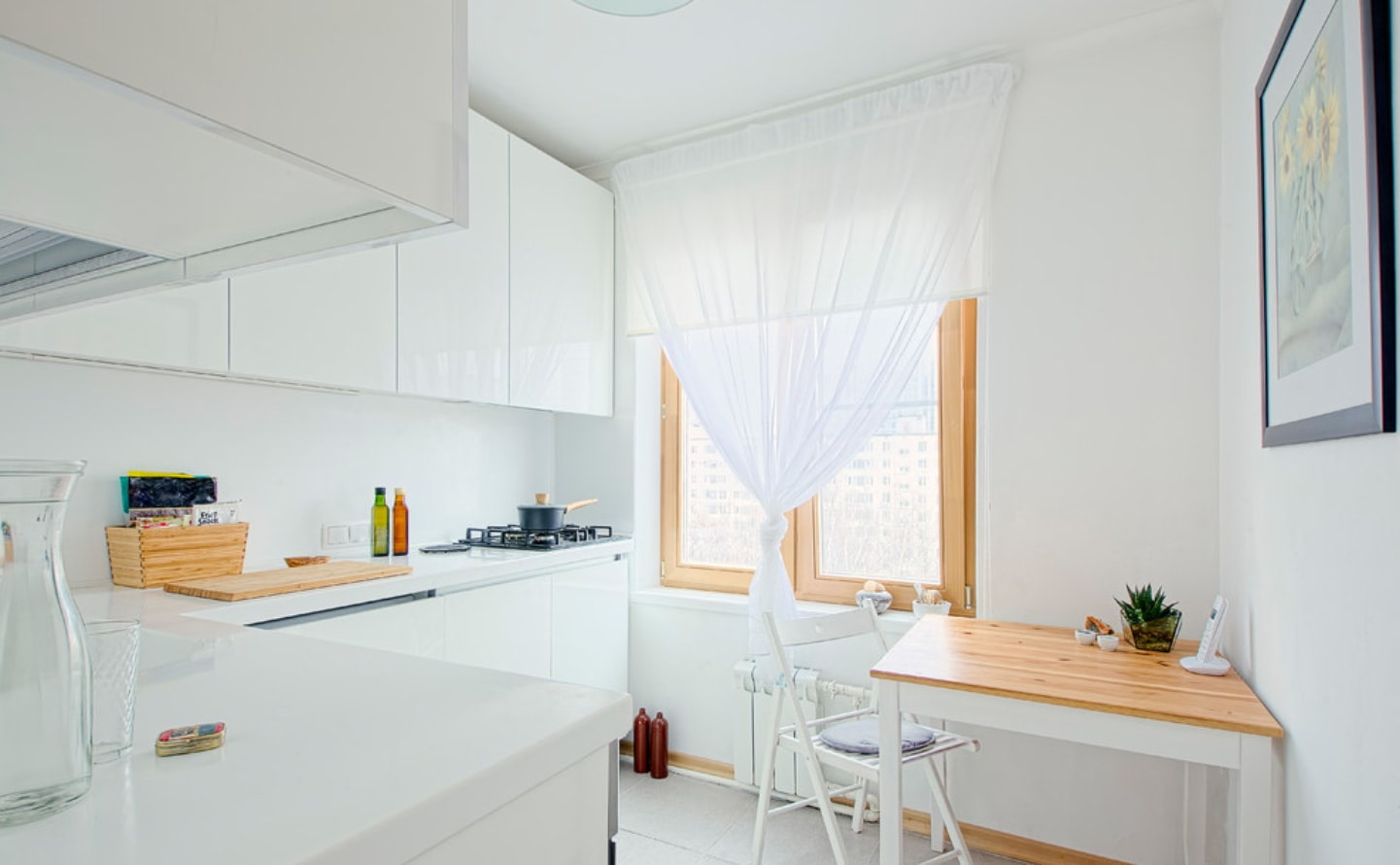 It is widely believed that tulle takes up a lot of space and is a bad solution for decorating a kitchen window in a small kitchen.