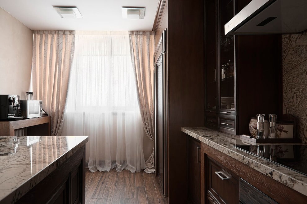 An aristocratic color that can emphasize the status of the owner of a kitchen with such curtains. The interior with brown tulle creates a sense of isolation and security. This color also has a significant drawback: in combination with dark furniture, it visually reduces the area of the kitchen.