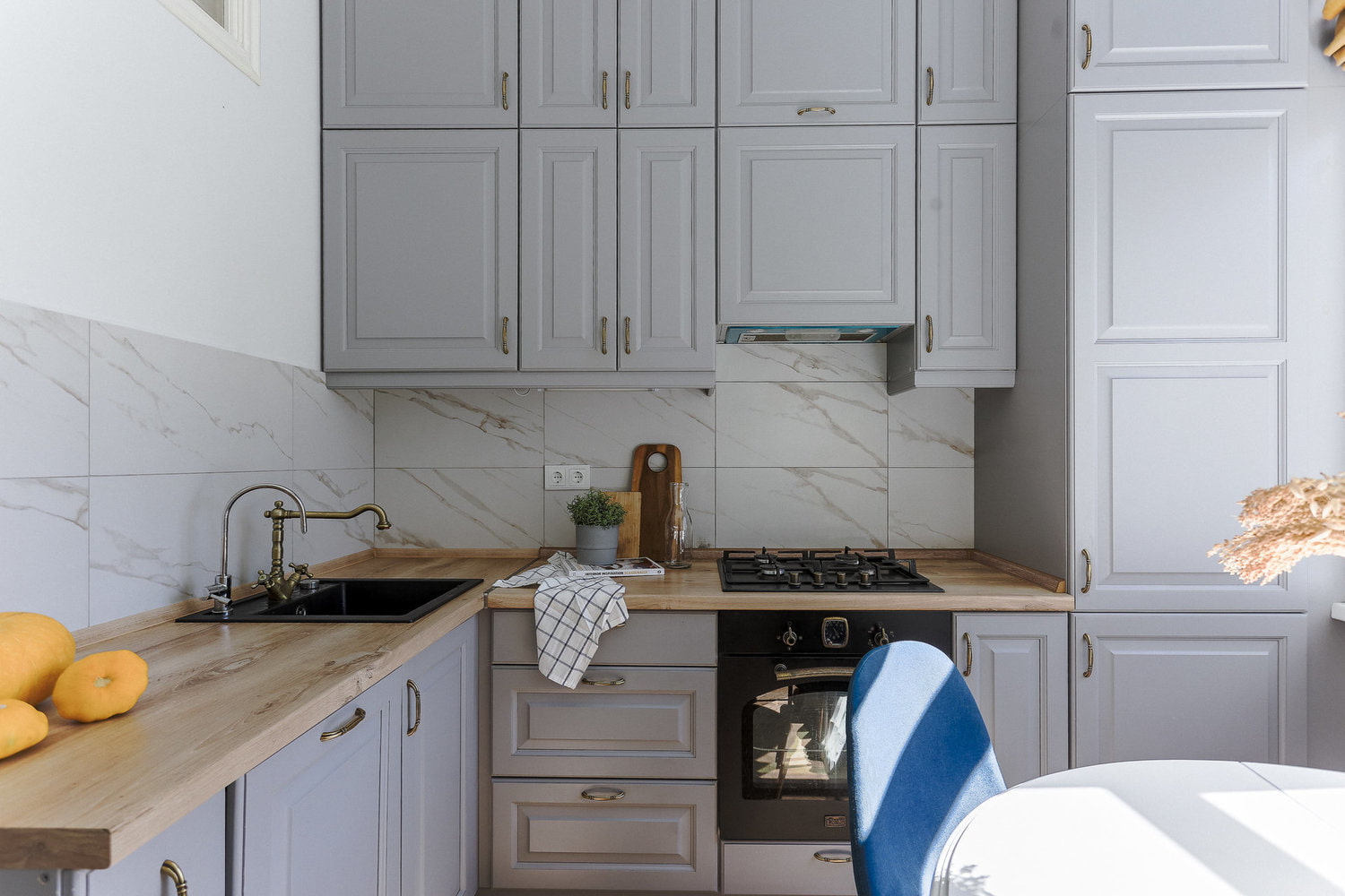 The technique, which is hidden behind the facades and is located under a single tabletop, does not interfere with the design. A gas stove, as a rule, hides space, so when replacing it, think about a two-burner panel: if you cook a little, the technique will allow you to expand the kitchen not only visually, but also functionally.