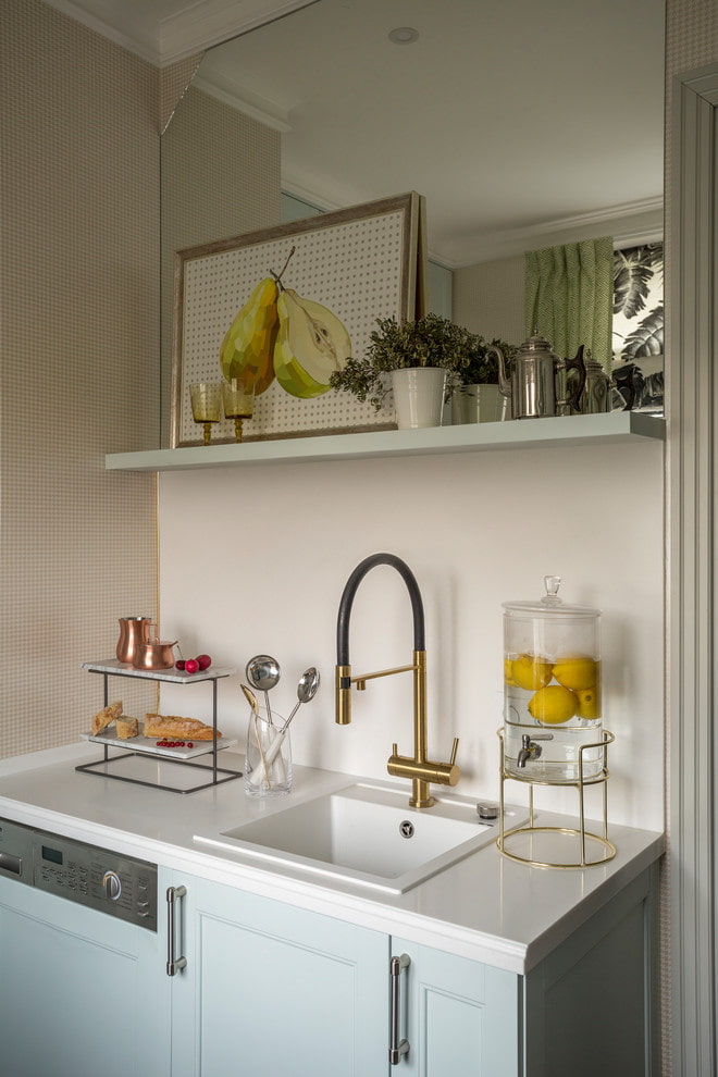 This favorite design technique for expansion of any premises works flawlessly. White, cream and light blue tones in wall decoration and the ceiling reflect light, thereby making the kitchen more spacious. Don't be afraid to use light colored furniture. - it gets dirty no more than dark, and modern materials do not cause difficulties when cleaning surfaces.
