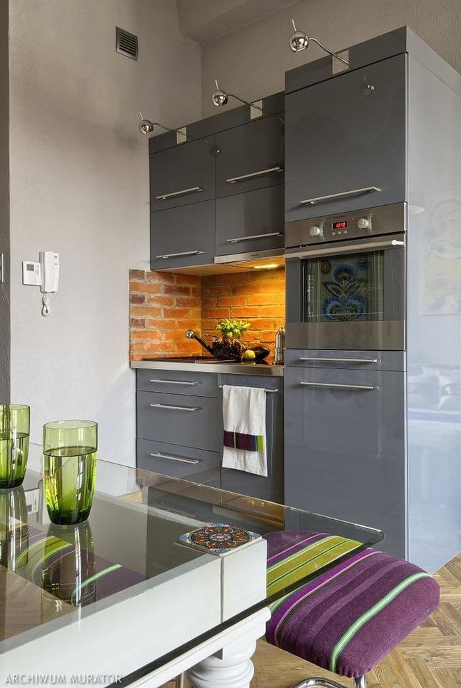 Set concise tempered glass apron or decorate the wall with ceramic tiles without a pattern. Choose paint, decorative plaster or wallpaper without sharp contrasting transitions, otherwise the room will seem cramped.
