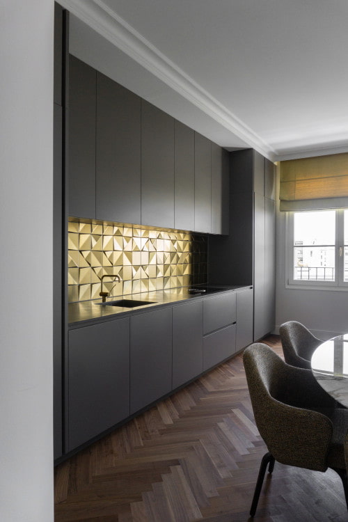 The gold color in the interior is quite insidious: on the one hand, it is a symbol of luxury, wealth, prosperity. On the other hand, if used improperly, the golden cuisine will turn out tasteless, pretentious - this style is also called "gypsy chic".