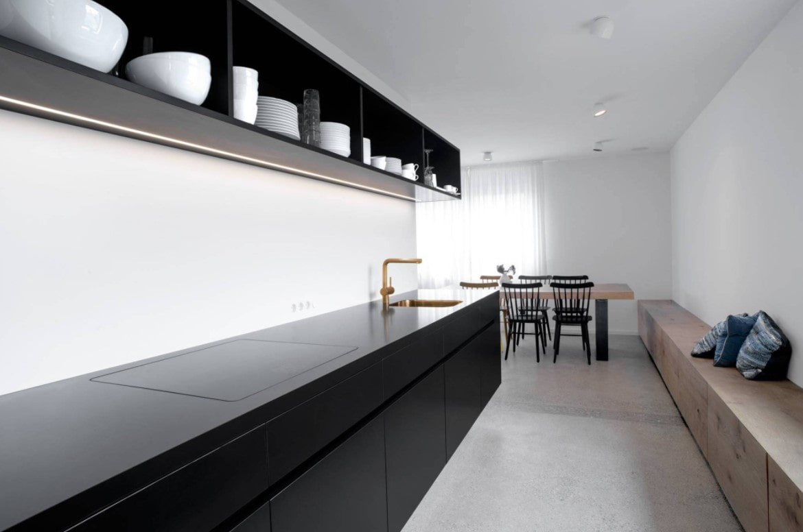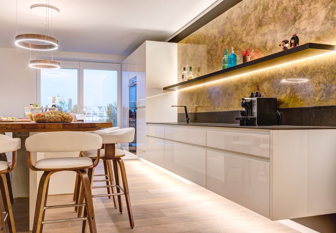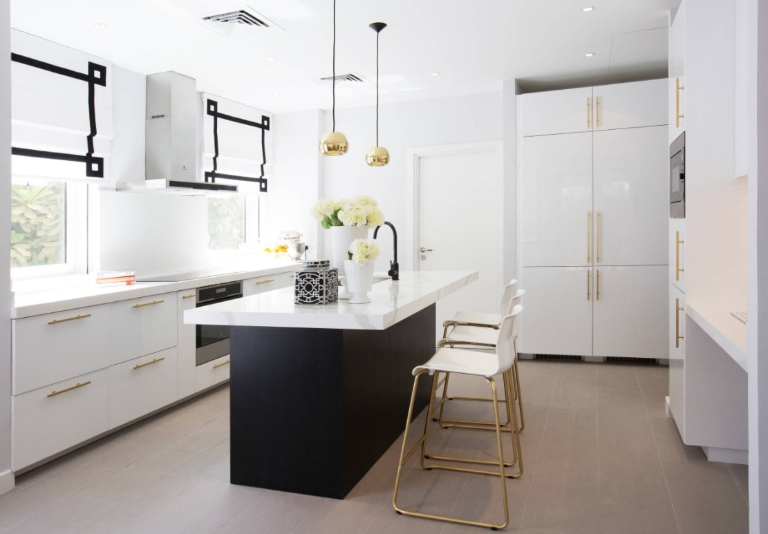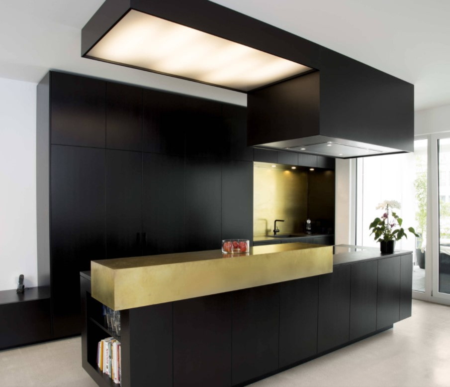 A kitchen with gold in a modern style is completely different. For the base, they usually choose white or black, and gold can be represented by only one, but very bright detail: for example, a mixer.