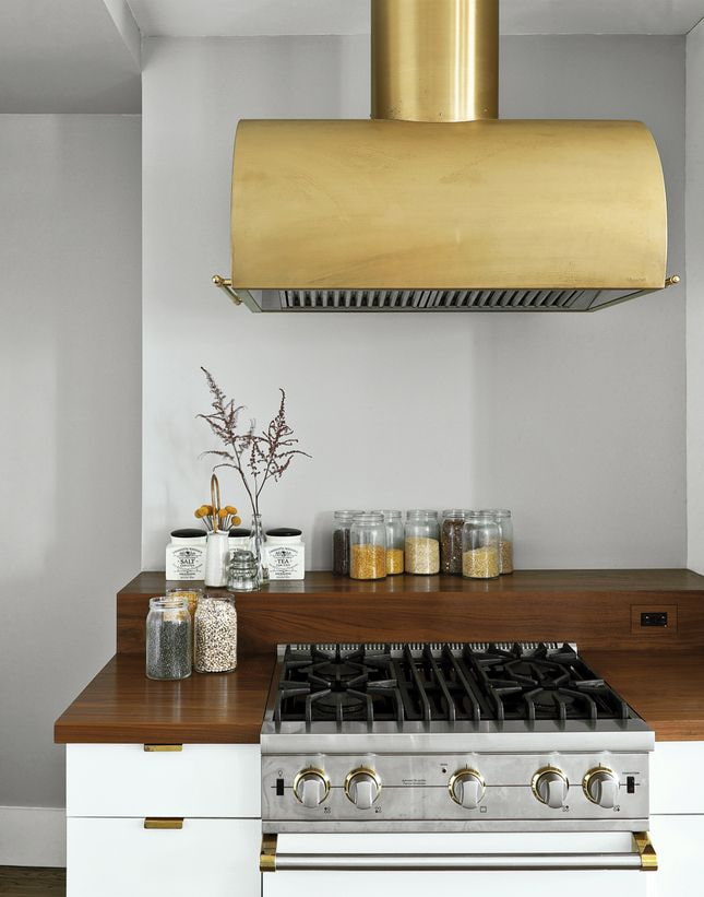 A gold-plated range hood, when done right, can be a star in the kitchen: choose a stylish freestanding model and place it on the empty wall above the hob. Such a device is guaranteed not to be left without attention..