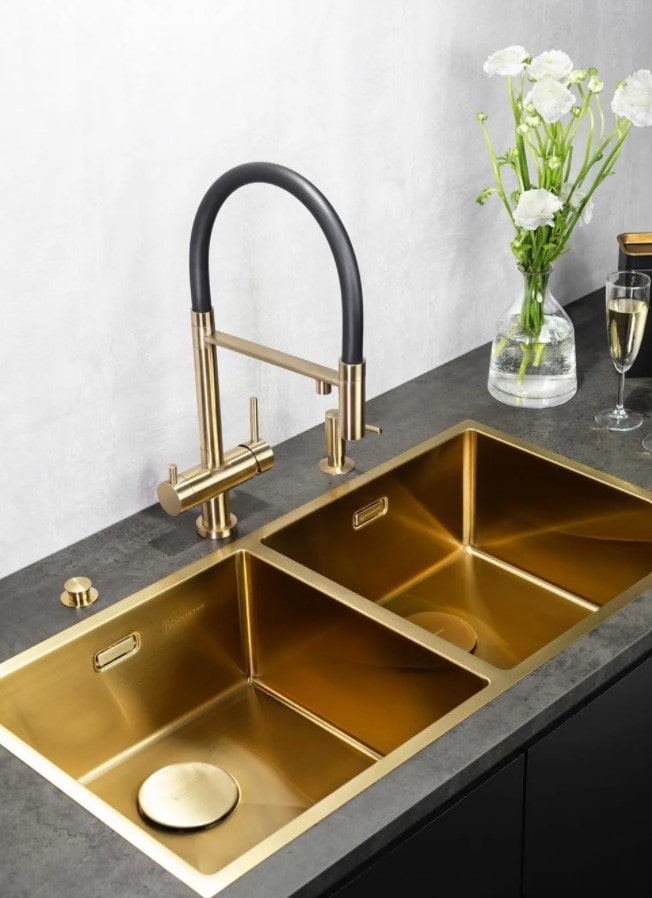 The interior of a golden kitchen requires a thorough approach to the selection of sanitary ware: since the mixer is an important part of the design, you can't afford a plain chrome model... Look for either entirely in gold, or compiled with black, white elements.