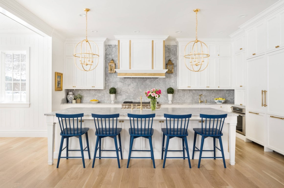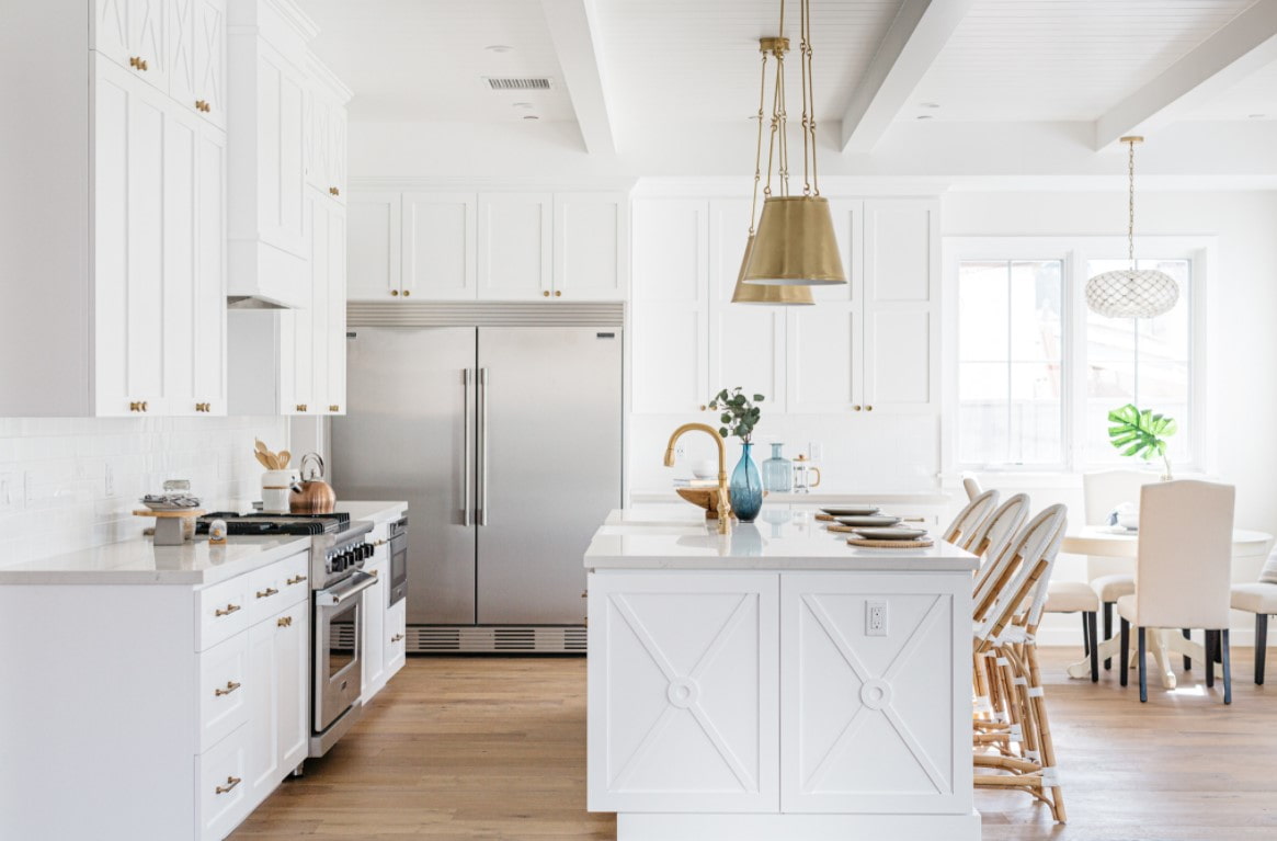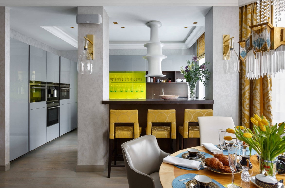 Light sources are an easy way to maintain a chosen accent color in a decor. Chandelier over the dining area, built-in ceiling lights, separate sconces - any of the options can be found in gold.