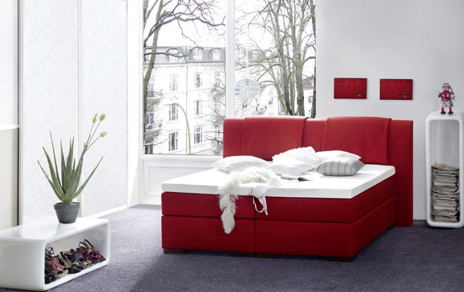 Photos of bedrooms with red beds.