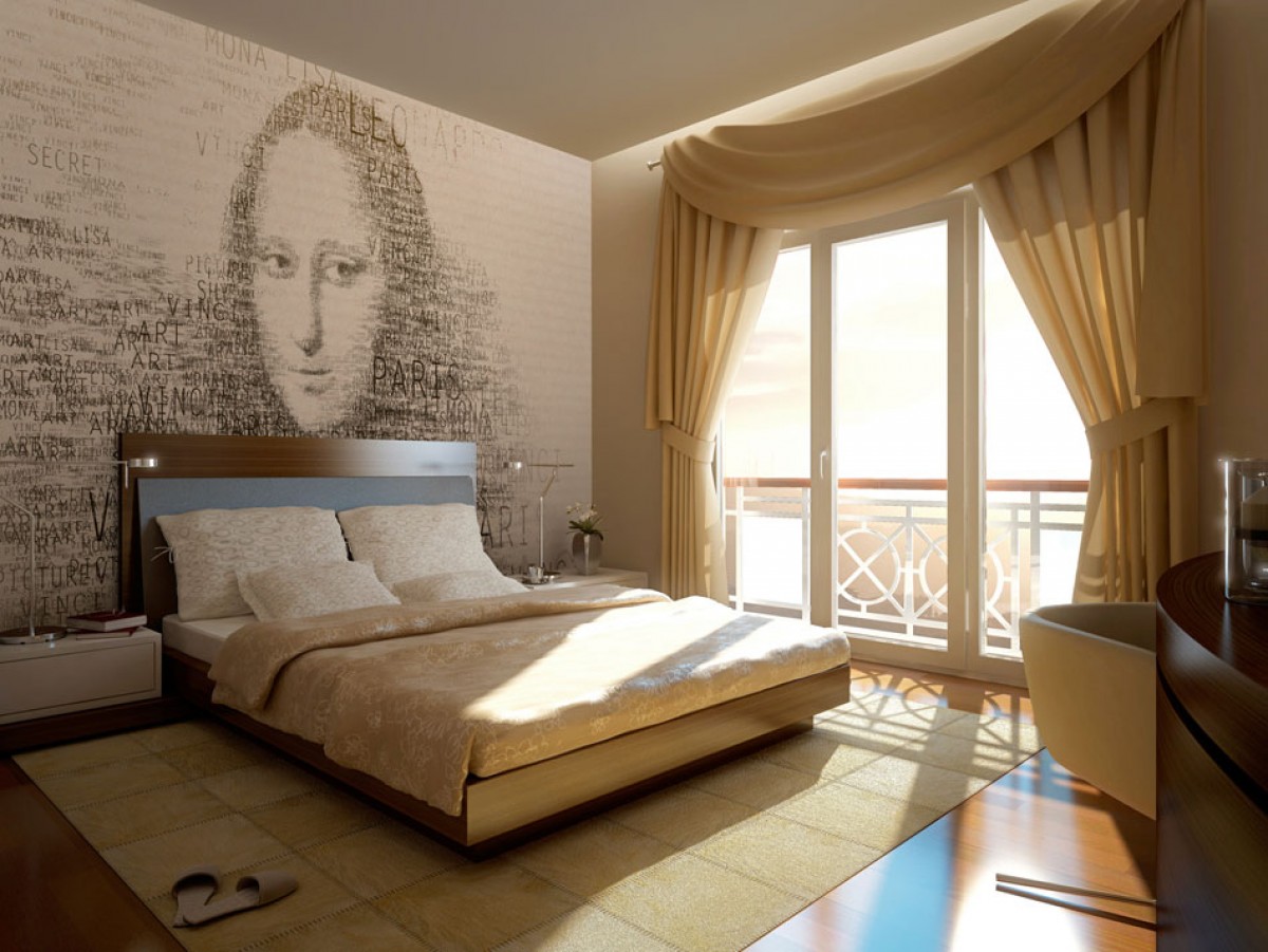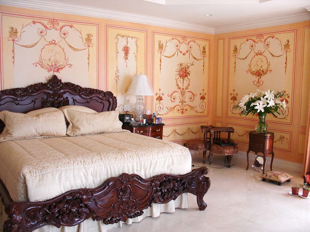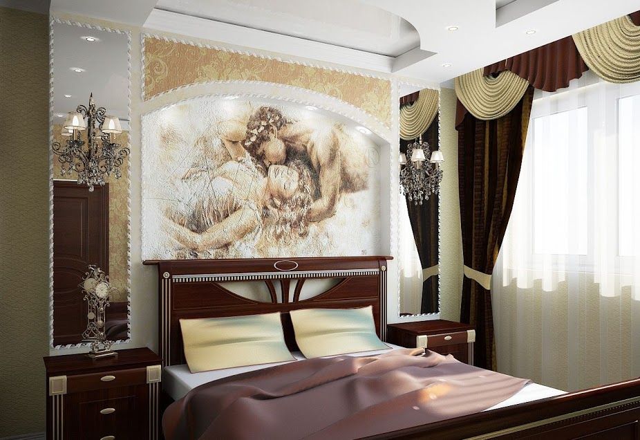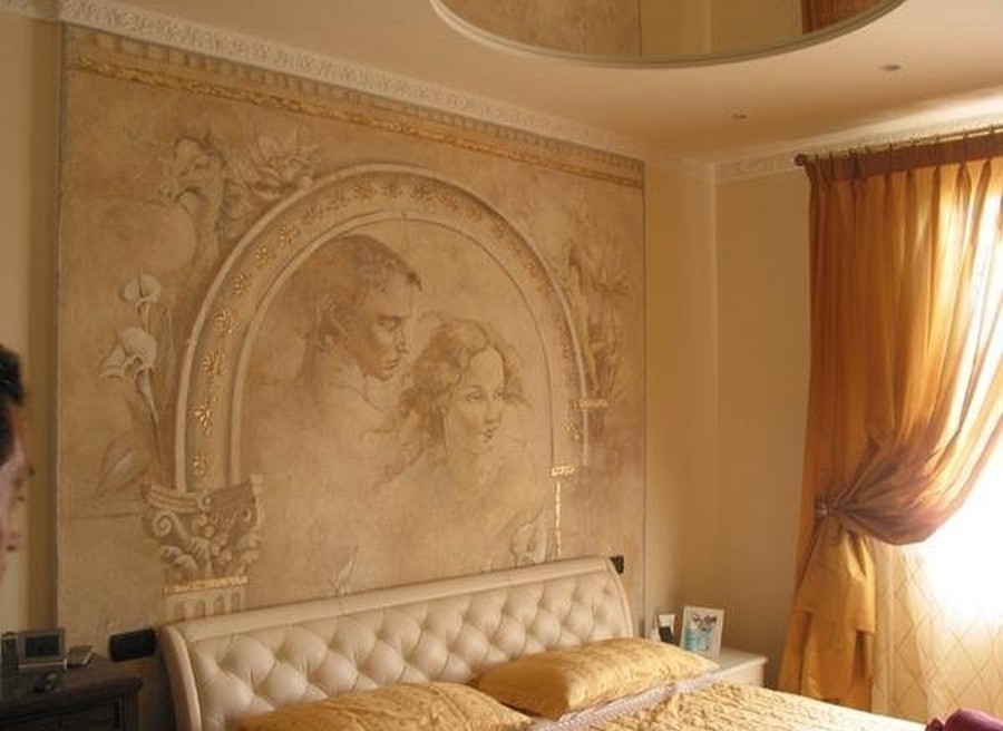 Wall painting has been known since antiquity. The first picturesque drawings on raw plaster were created in ancient times. For the bedroom decor of connoisseurs of classical art, photo wallpapers with imitation of frescoes are perfect.
