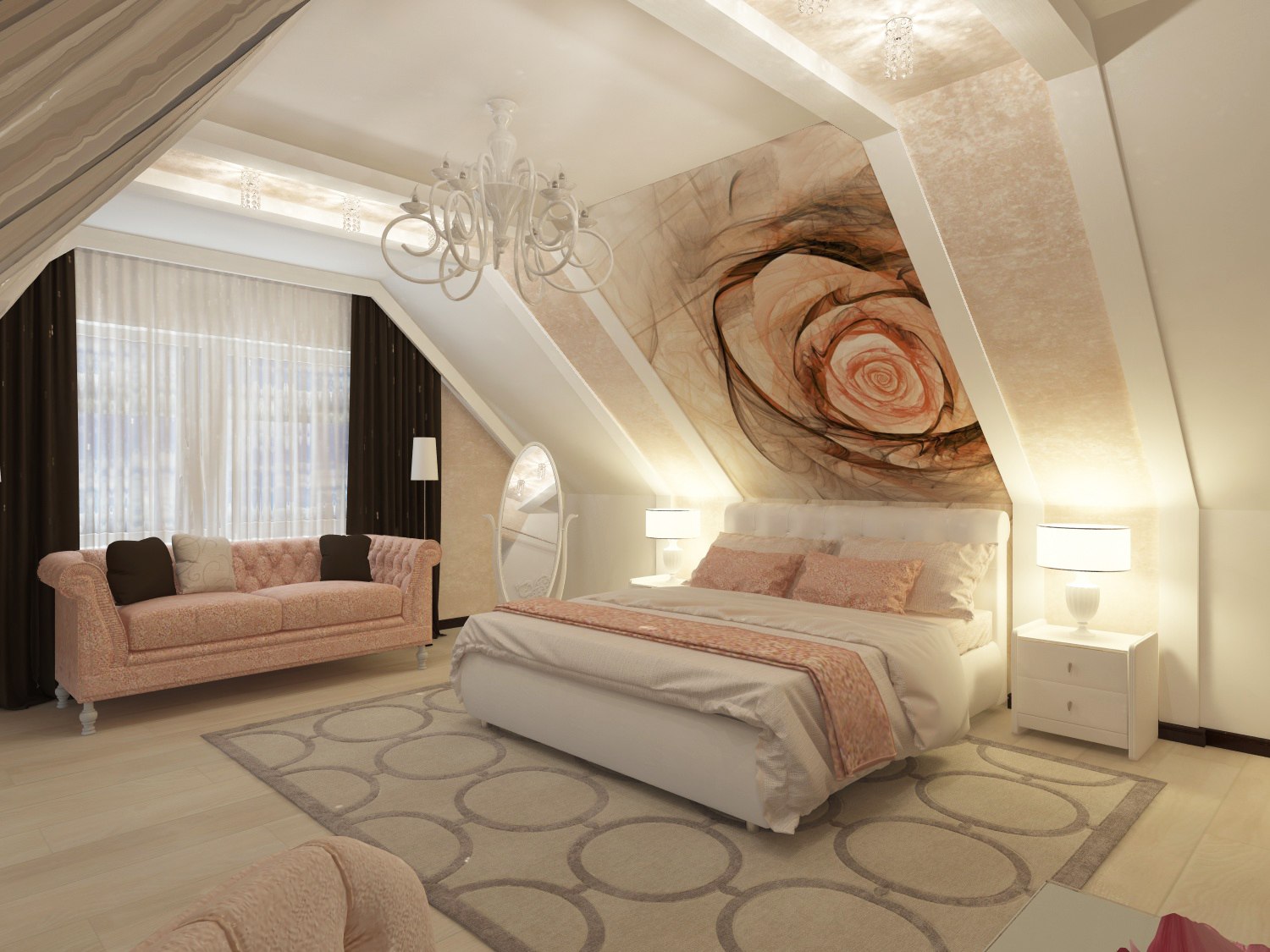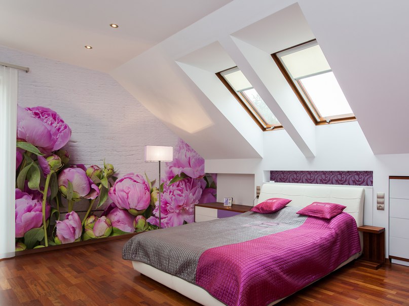 Using photo wallpaper on the wall in the bedroom on the attic floor helps to create an additional feeling of coziness and habitability of the space, as well as to emphasize the originality of the layout.