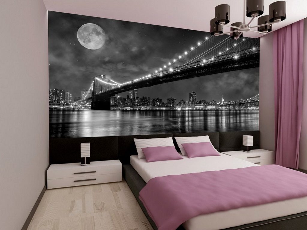 Wall murals with the image of the city are suitable for active people. For a bedroom, the night city is the most successful. Such a design solution will organically fit into the room of a teenager, especially a boy. Sunset in Paris is more suitable for the girl. New York and London with their famous bridges are also very popular.