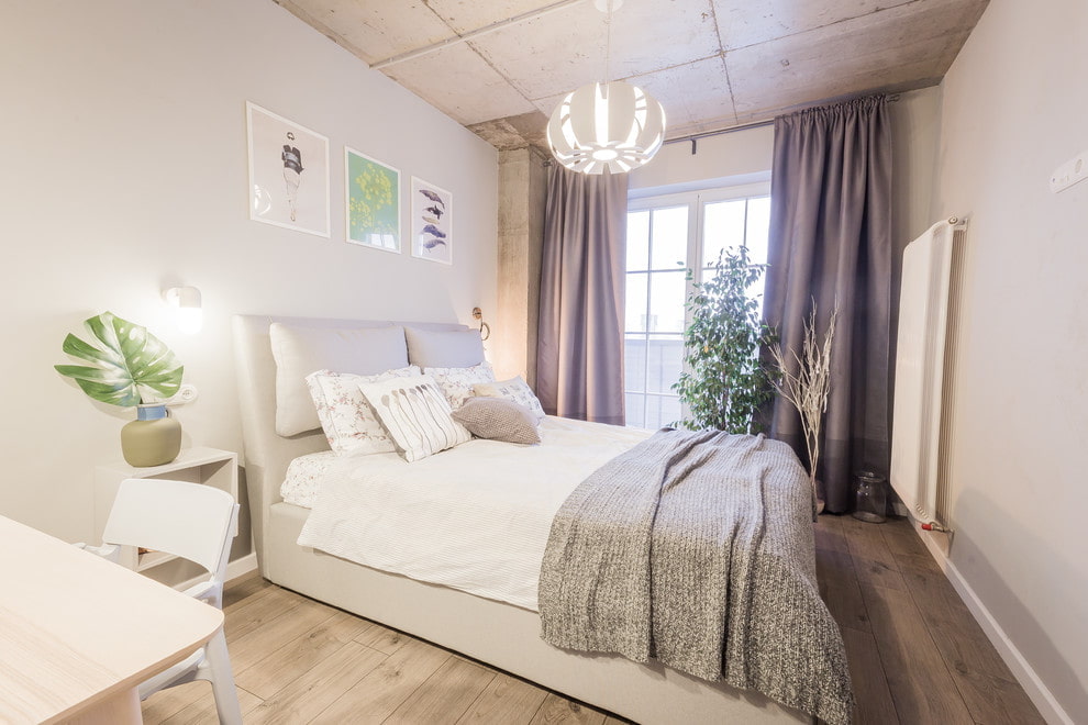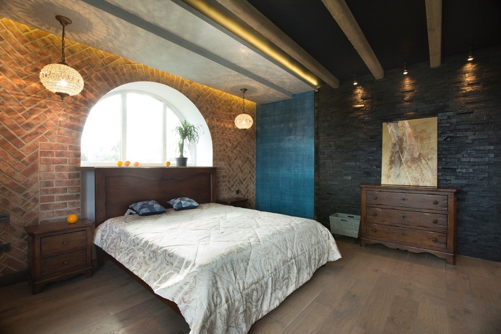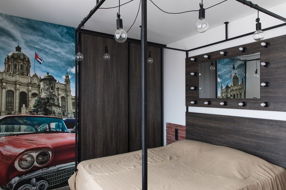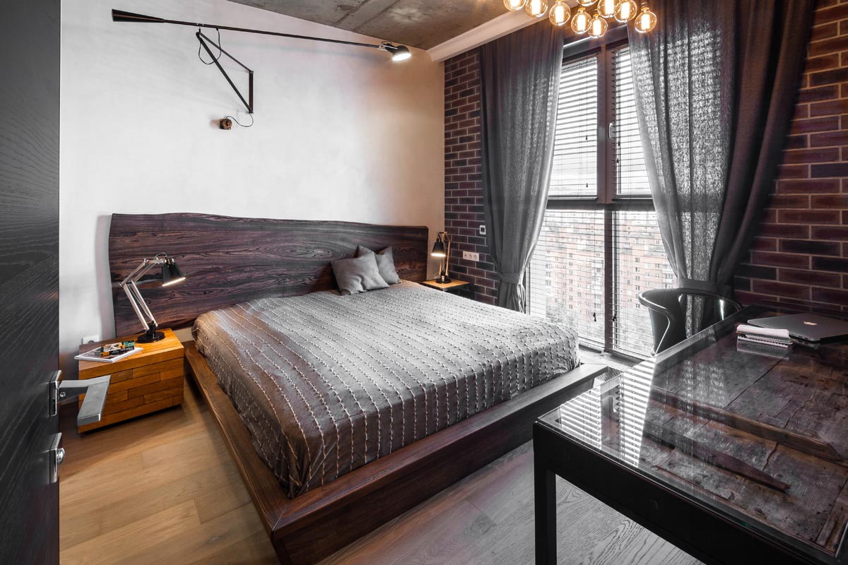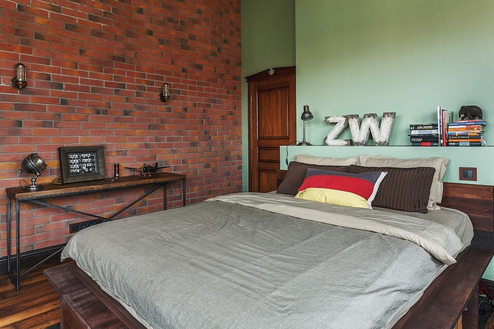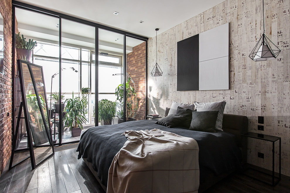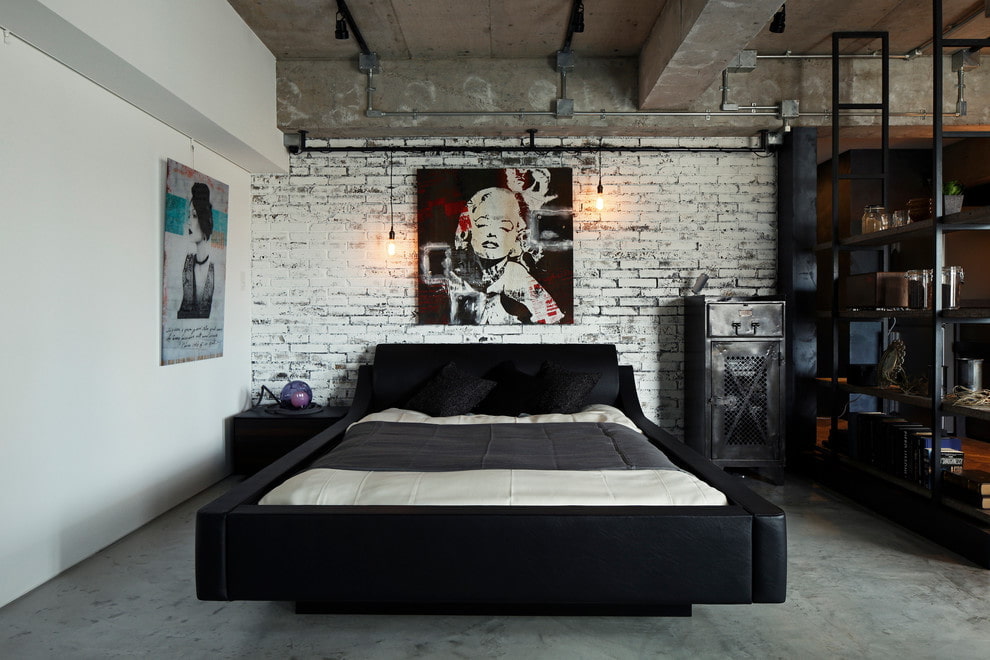 The loft-style interior has an unfinished and uninhabited look, which gives the bedroom a special charm. Industrial-urban design is perfect for creative and freedom-loving people.
