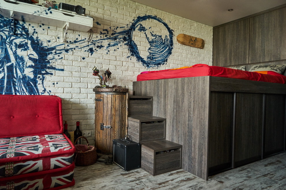 For a young guy or man, the interior is decorated in brown, dark green or gray tones with red or blue accents. A men's loft-style bedroom should first of all be practical and comfortable. There is no unnecessary decor and textile elements.