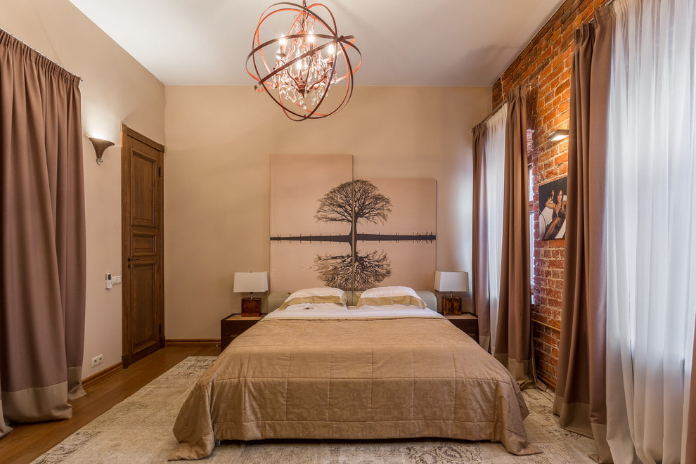 To maintain the overall style of the bedroom, lamps or lanterns with long wires or chains are often chosen. Such lamps are often distinguished by their antique look.