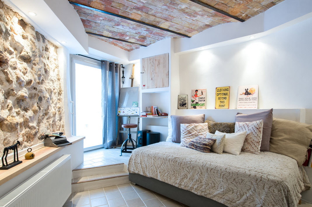 The final stage in creating a loft-style bedroom design will be the choice of decor. The room can be decorated with homemade shelves, antique flower vases, old plates, or rough-framed mirrors.