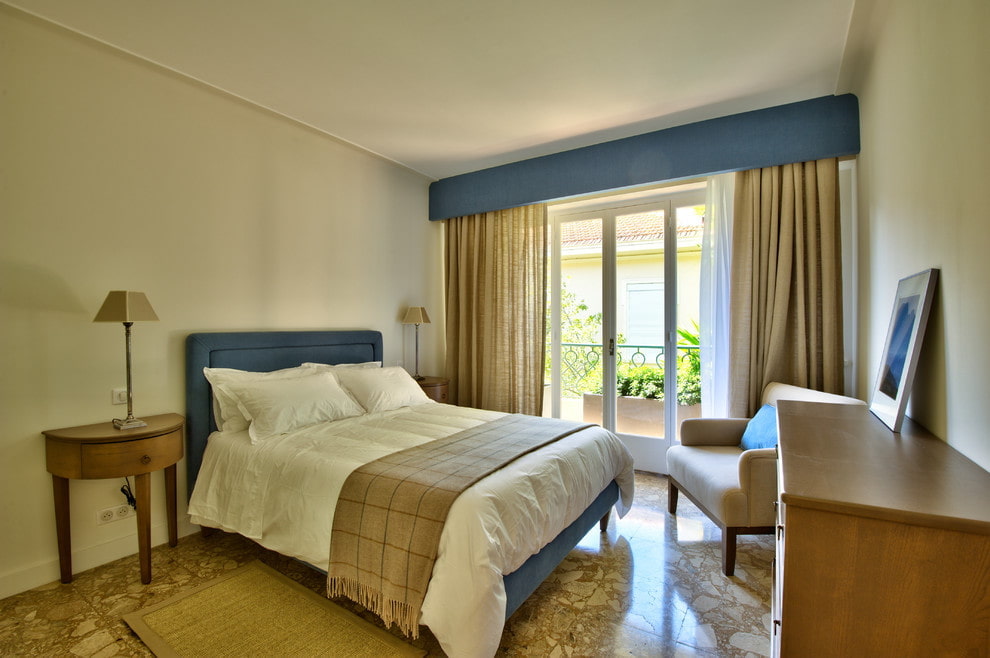The photo shows a bedroom in pastel colors for a person who is not prone to insomnia and wakes up refreshed and refreshed.