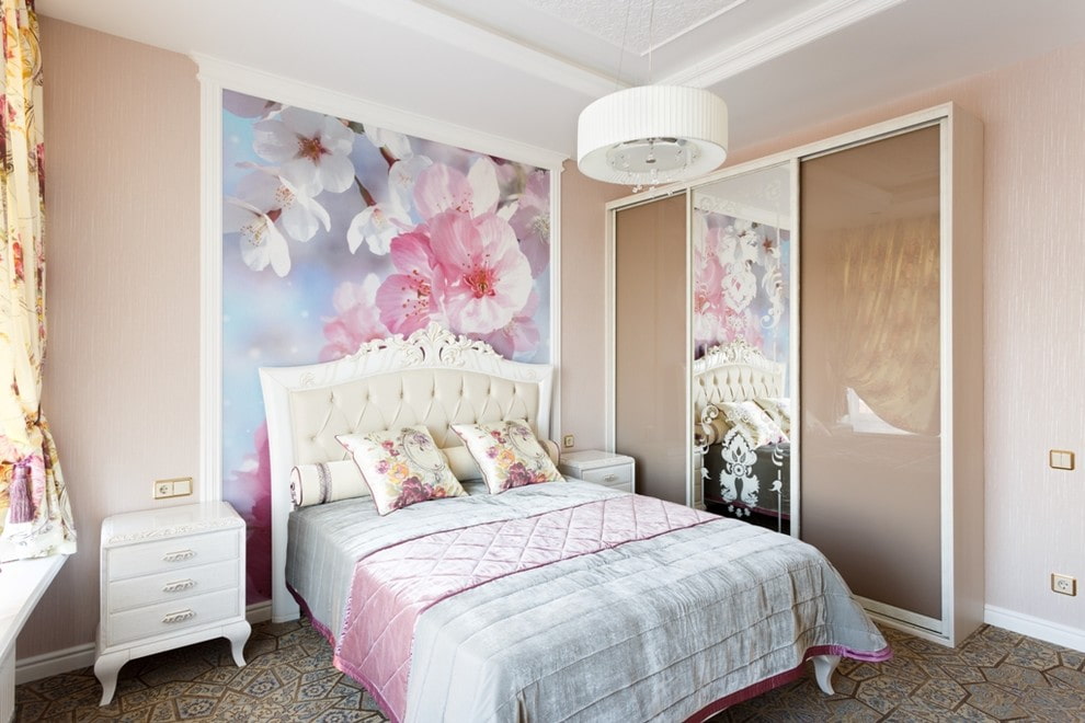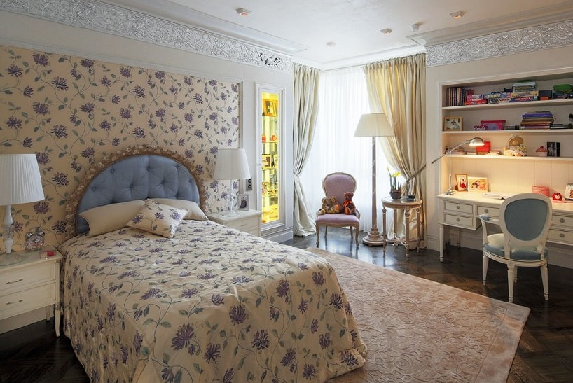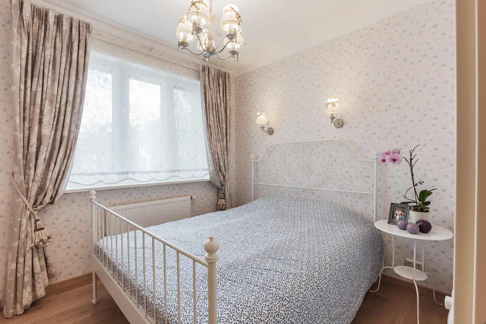 This style is characterized by lightness and elegance, coupled with provincial naivety. The decor of the bedroom also uses textiles of soothing colors and floral patterns. The bed can also be metal, airy, with chiseled legs and a wrought-iron headboard.
