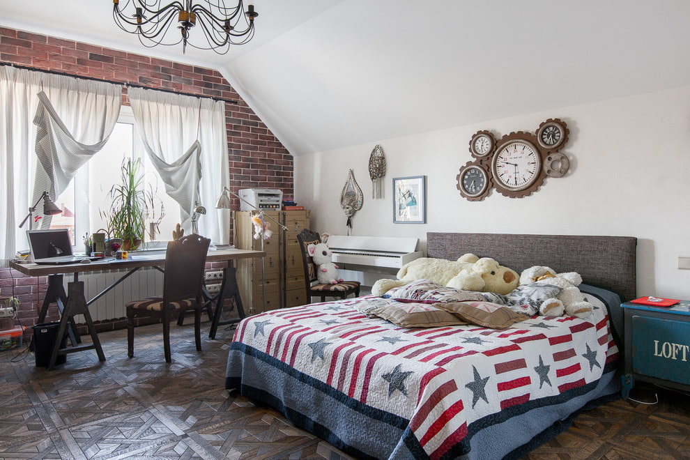 Distinctive features of the loft are the rudeness of the finishing materials and the deliberate "abandonment" of the environment. To maintain this direction, backs made of wood are suitable, as well as imitation of bricks over the sleeping area.