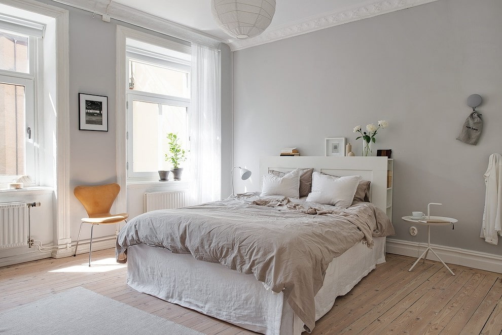 Scandi beds are made of light wood or painted with white paint. The models have a simple shape with a rectangular headboard. There are almost no decorative elements.